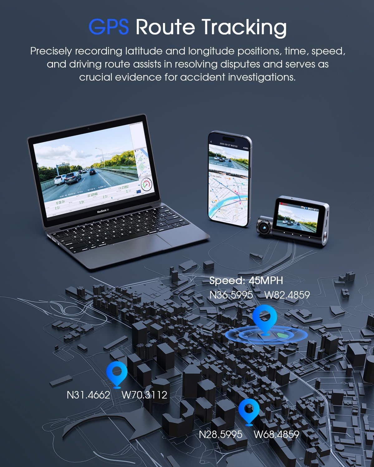 - Built-in GPS: Built-in GPS enhances this 3-channel dash cam with advanced tracking capabilities, providing precise location data for your journeys; With GPS integration, you can accurately record and timestamp your footage, track speed, latitude, longitude, and driving route; In emergencies, easily access this valuable information for evidence through the APP or GPS Player (Rea*ch out to us to download the correct GPS Player)