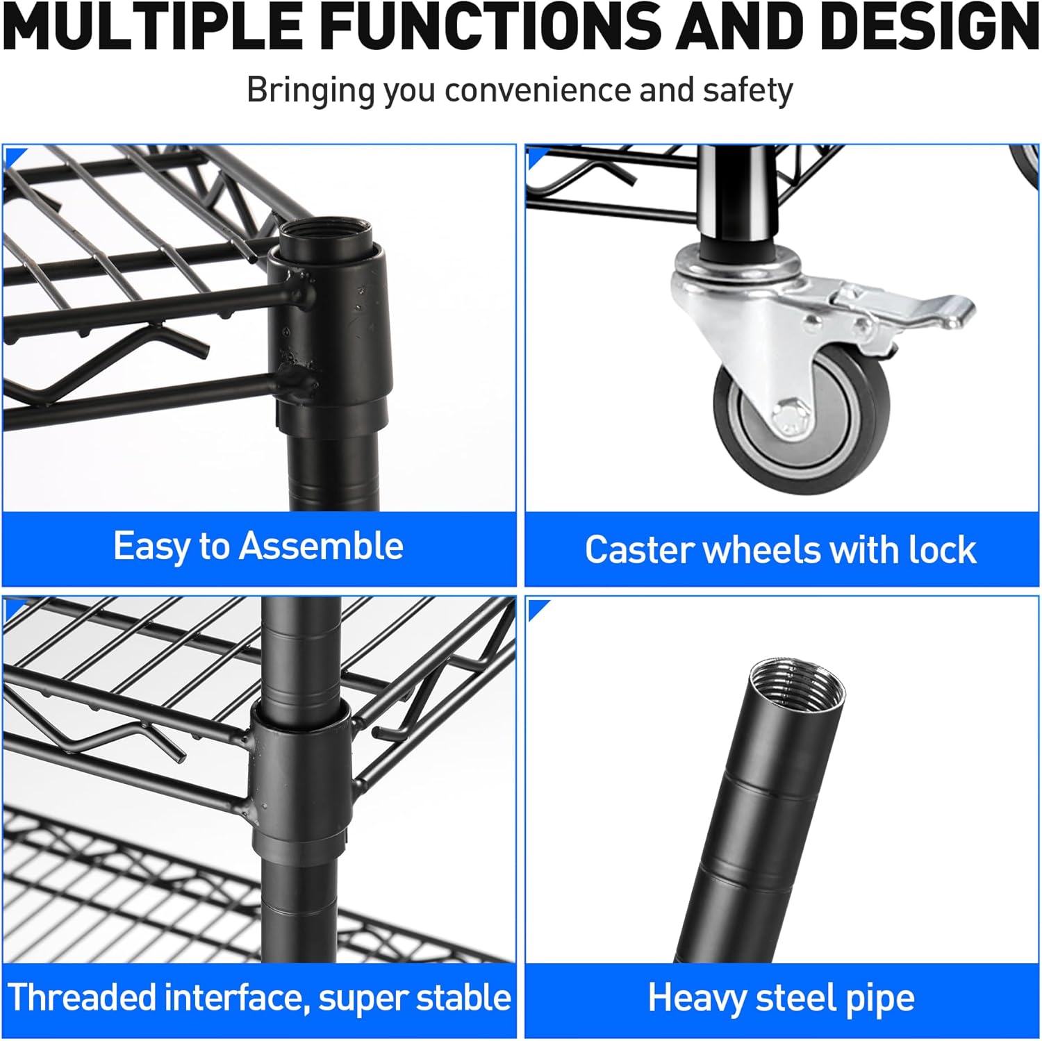 - Perfect Size, Strong Capacity: 60" L x 24" W x 82" H, with high-quality commercial wheels. The 4 wheels can be easily positioned. 2 wheels have a smart lock function for safety. The wire shelf rack has a large capacity and high practicability, and it is the best choice for you to keep the place tidy