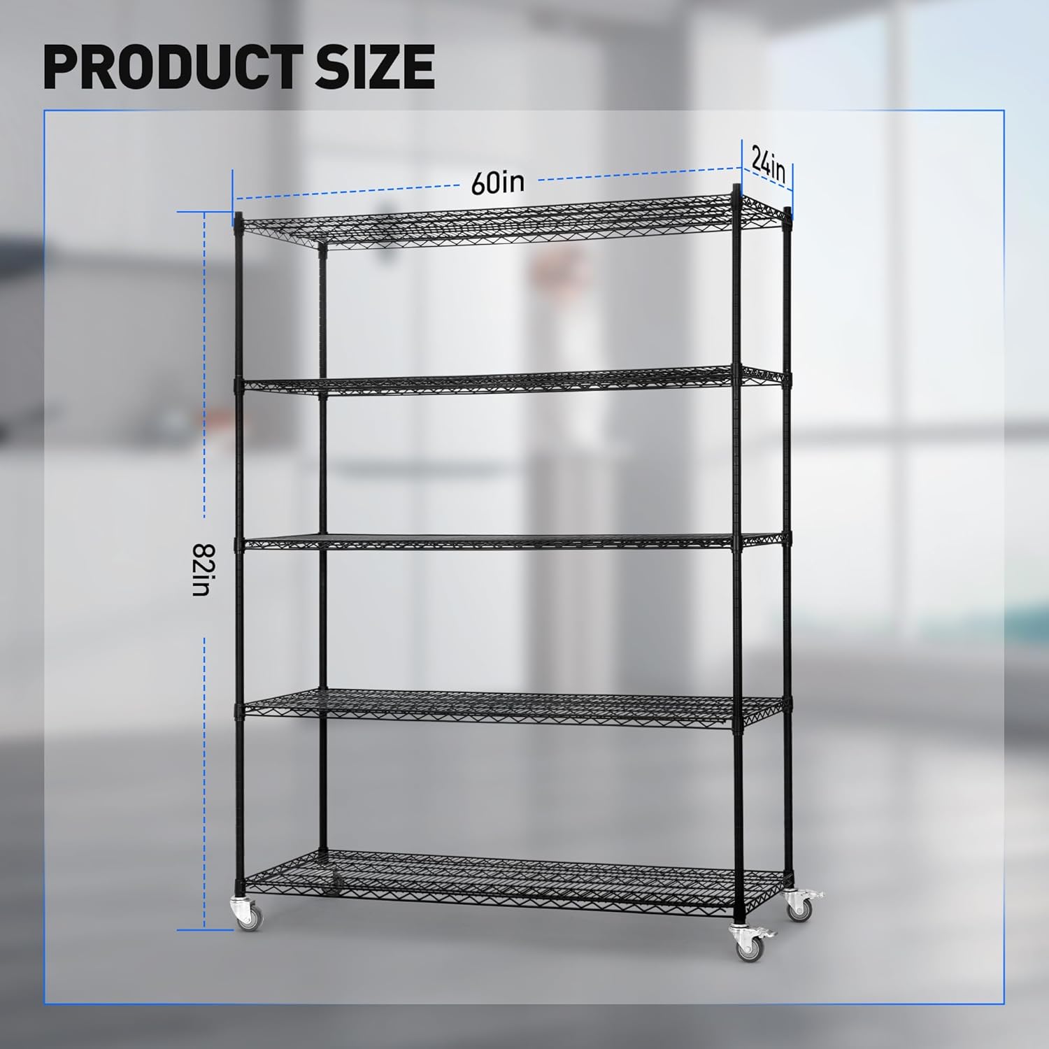 5 Tier Wire Shelf Shelving Unit, 60"x 24"x82" Metal Storage Shelves, Heavy Duty Garage Storage Shelves with Wheels, Chrome 3000LBS Capacity Wire Shelf Rack for Restaurant, Garage, Pantry, Kitchen