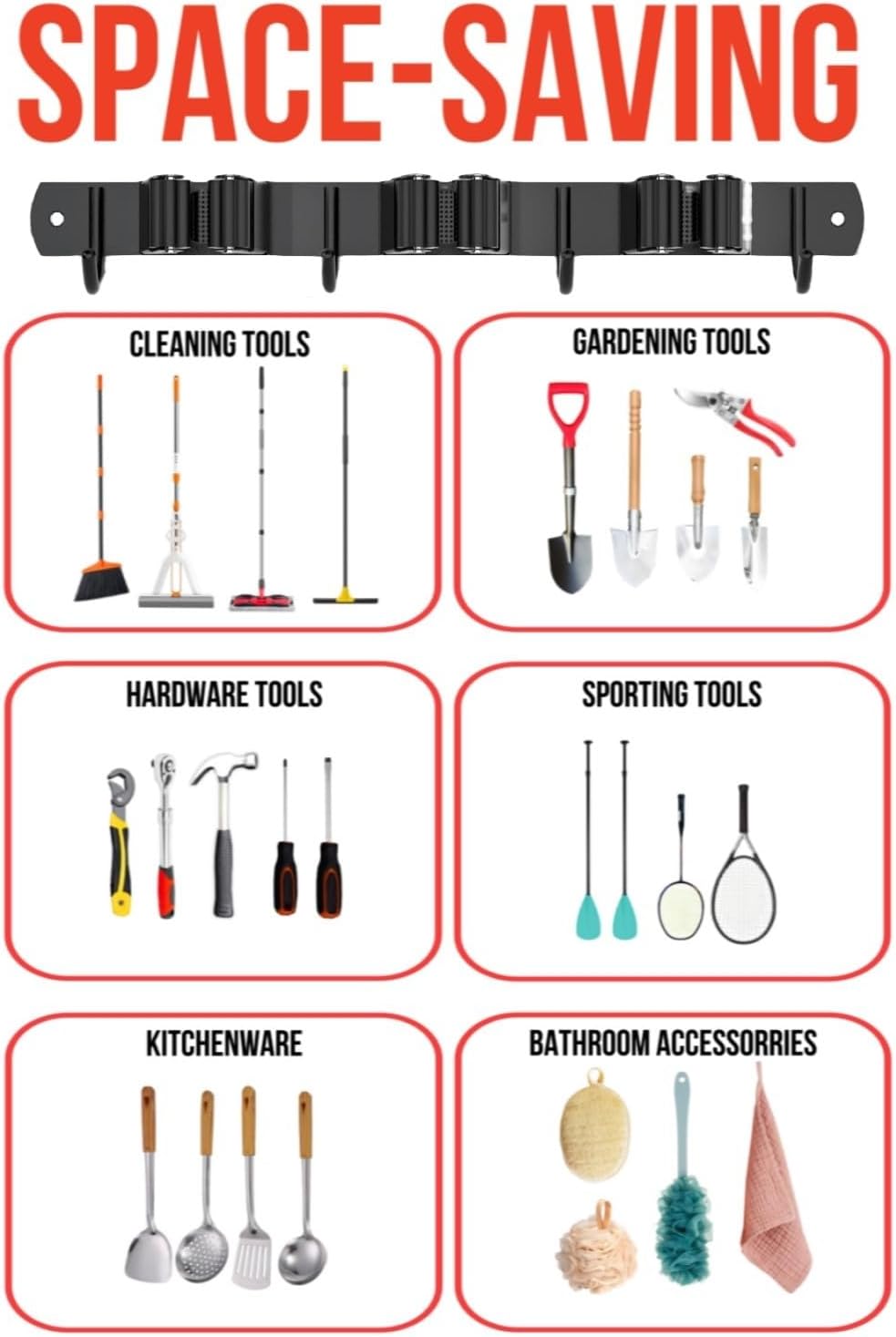 - SAVE SPACE: The wall hangers for brooms and mops provides you easy access to store and grab brooms, dustpans, mops. This tool organizer with 5 gripers and 4 utility hooks allows you to hold brooms, mops, brushes, rakes, garden tools, etc