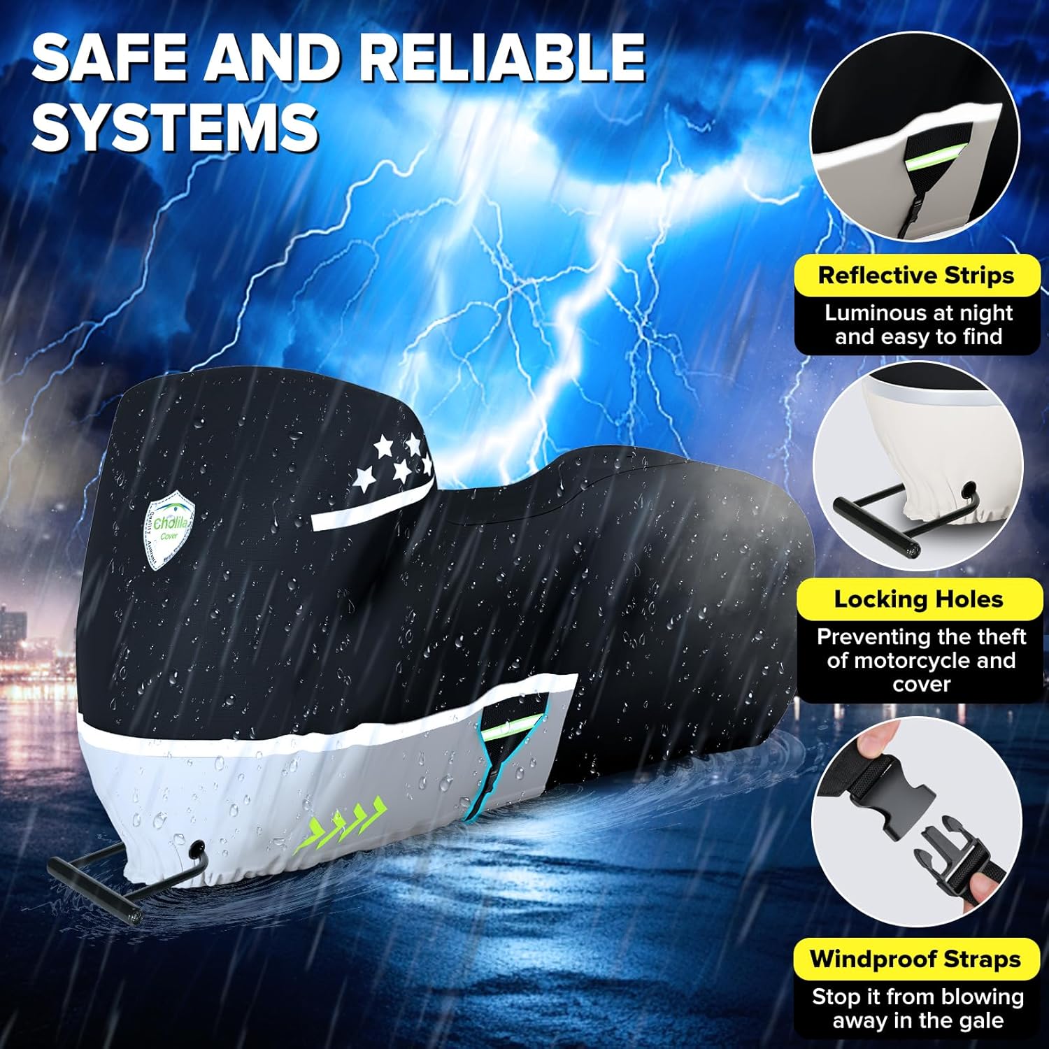 - Provides Excellent Protection: Premium materials give your motorcycle more excellent protection. Our motorcycle cover has been tested for tension and water pressure, which can withstand a tension of over 1000N and water pressure of over 6000PA. It can resist all the damage from outside. It has strong waterproof and tear-resistance ability