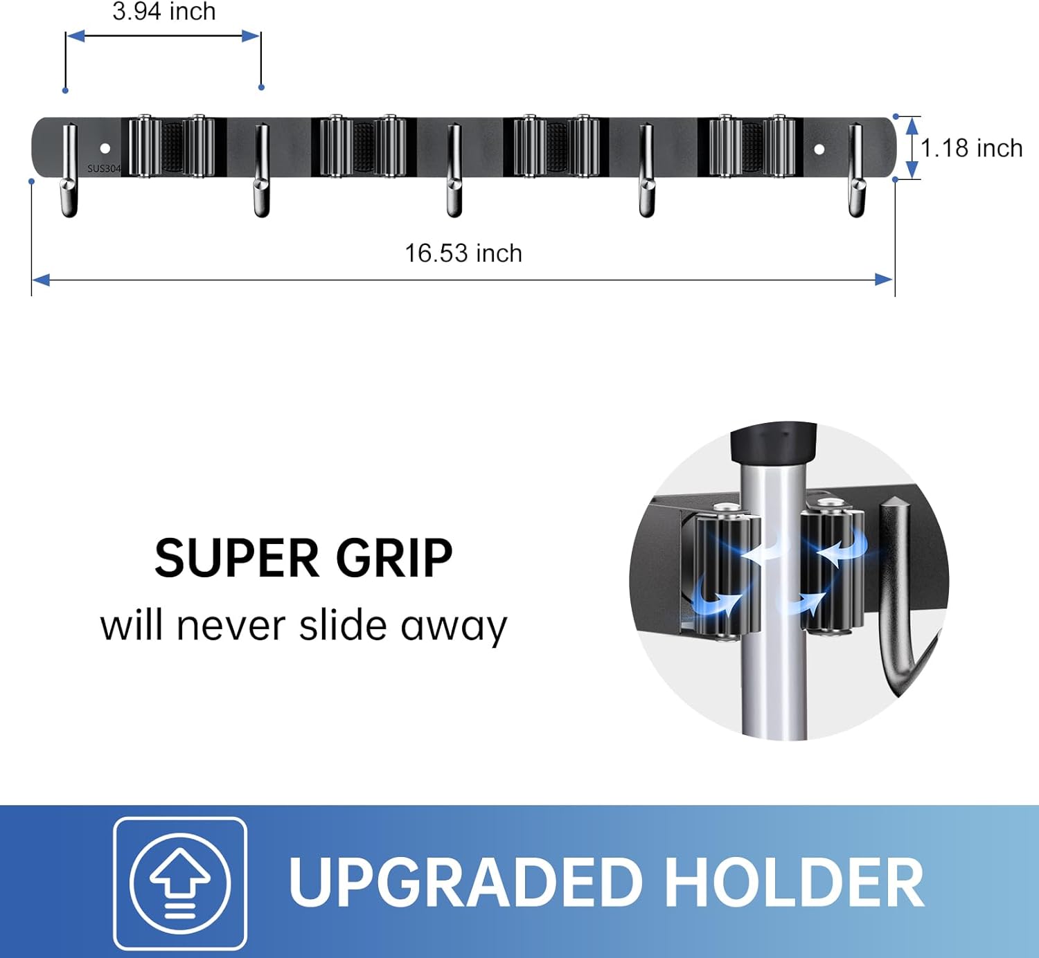 - 🏡【ORGANIZING & SAVING SPACE】Our broom and mop organizer wall hanging can keep messes organized in few minutes. Perfect for mounting your broom, mops, rakes, brushes and any other tools , saving space for your kitchen, garage, garden, laundry, closets, bathroom, office, commercial, etc..