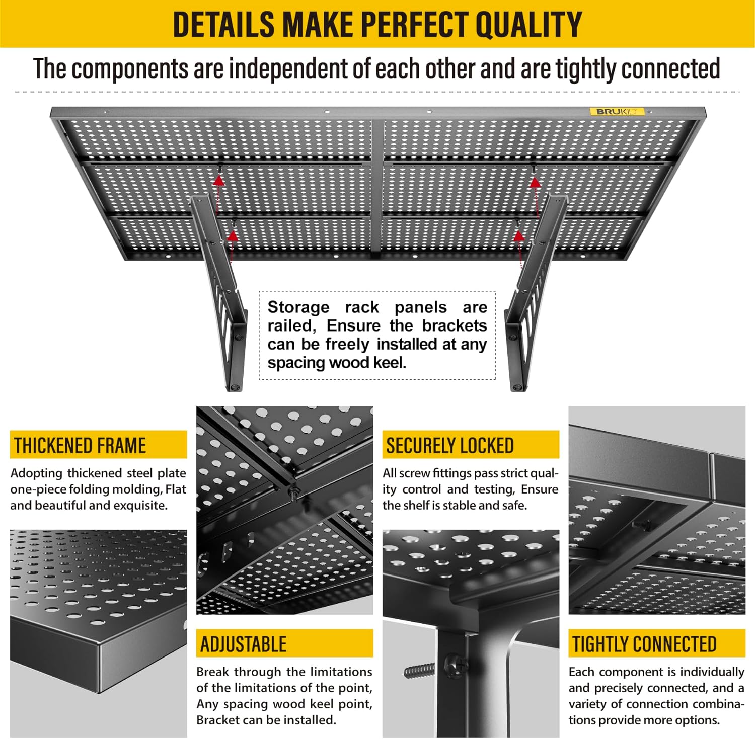 - SUPERIOR DESIGN: Wall shelf garage storage rack panel is made of whole piece of perforated steel plate bending and welding, the surface of matte high temperature powder baking paint, flat and smooth; the panel adopts slide rail design, can be adjusted by parallel left and right sliding at will; bracket can be freely installed in 33” range of the spacing of the wood wall keel, without affecting the precision connection with the panel, eliminating the worry of being unable to docking due to the mismatch of spacing points of load-bearing wood wall keel or inaccuracy of the installation of the bracket. It saves time and labor