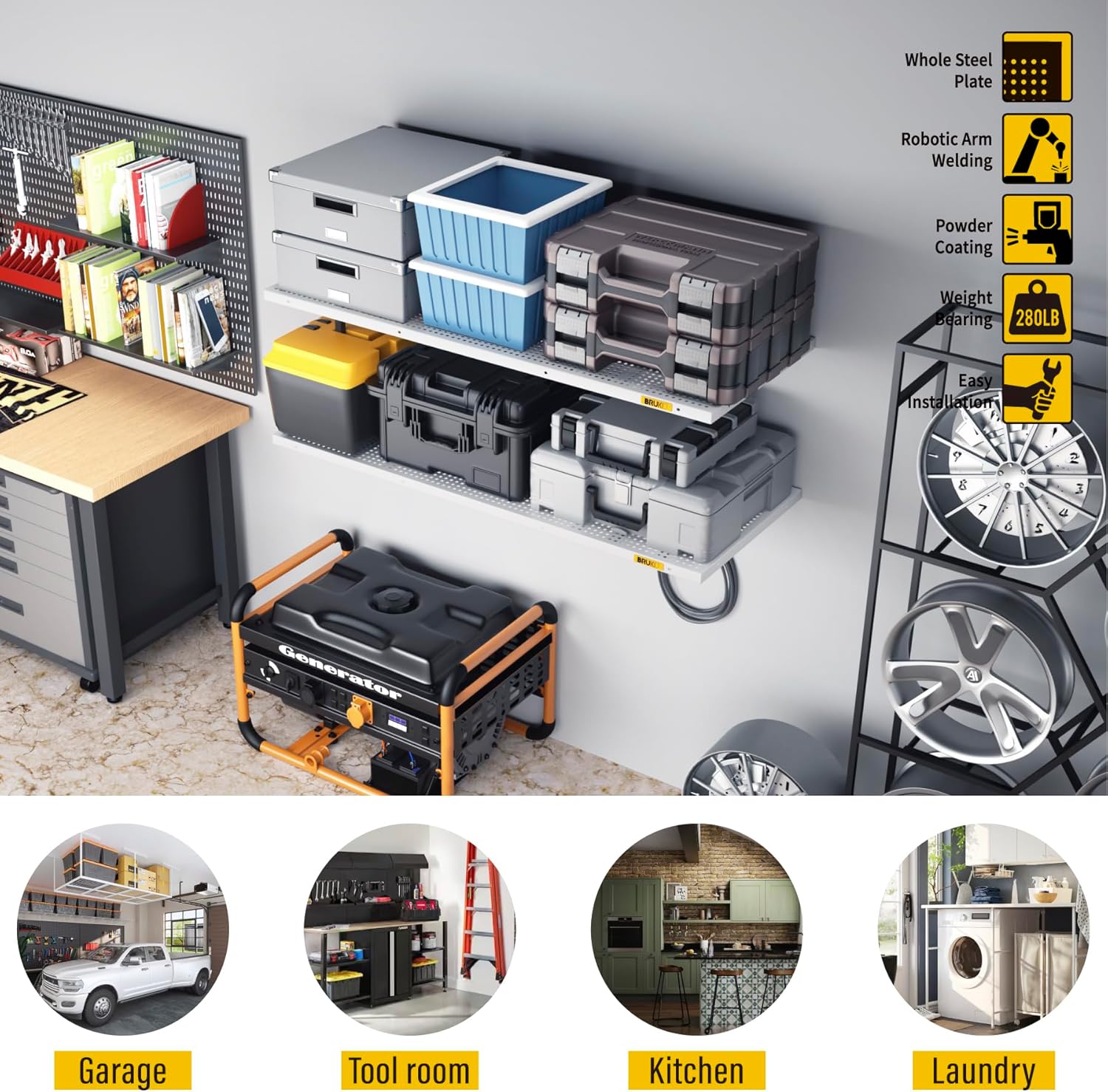 - SUPERIOR DESIGN: Wall shelf garage storage rack panel is made of whole piece of perforated steel plate bending and welding, the surface of matte high temperature powder baking paint, flat and smooth; the panel adopts slide rail design, can be adjusted by parallel left and right sliding at will; bracket can be freely installed in 45” range of the spacing of the wood wall keel, without affecting the precision connection with the panel, eliminating the worry of being unable to docking due to the mismatch of spacing points of load-bearing wood wall keel or inaccuracy of the installation of the bracket. It saves time and labor