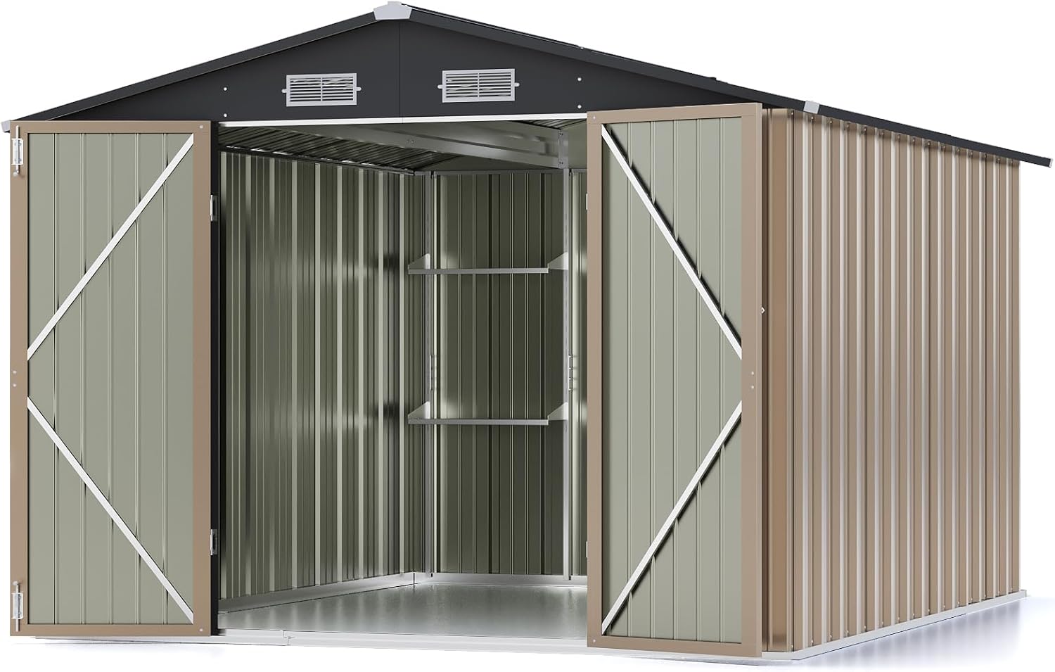 Patiowell 8x10 FT Outdoor Storage Shed with Detachable Storage Rack, Large Garden Tool Metal Shed with Sloping Roof and Double Lockable Door, Outdoor Shed for Backyard Garden Patio Lawn,Brown