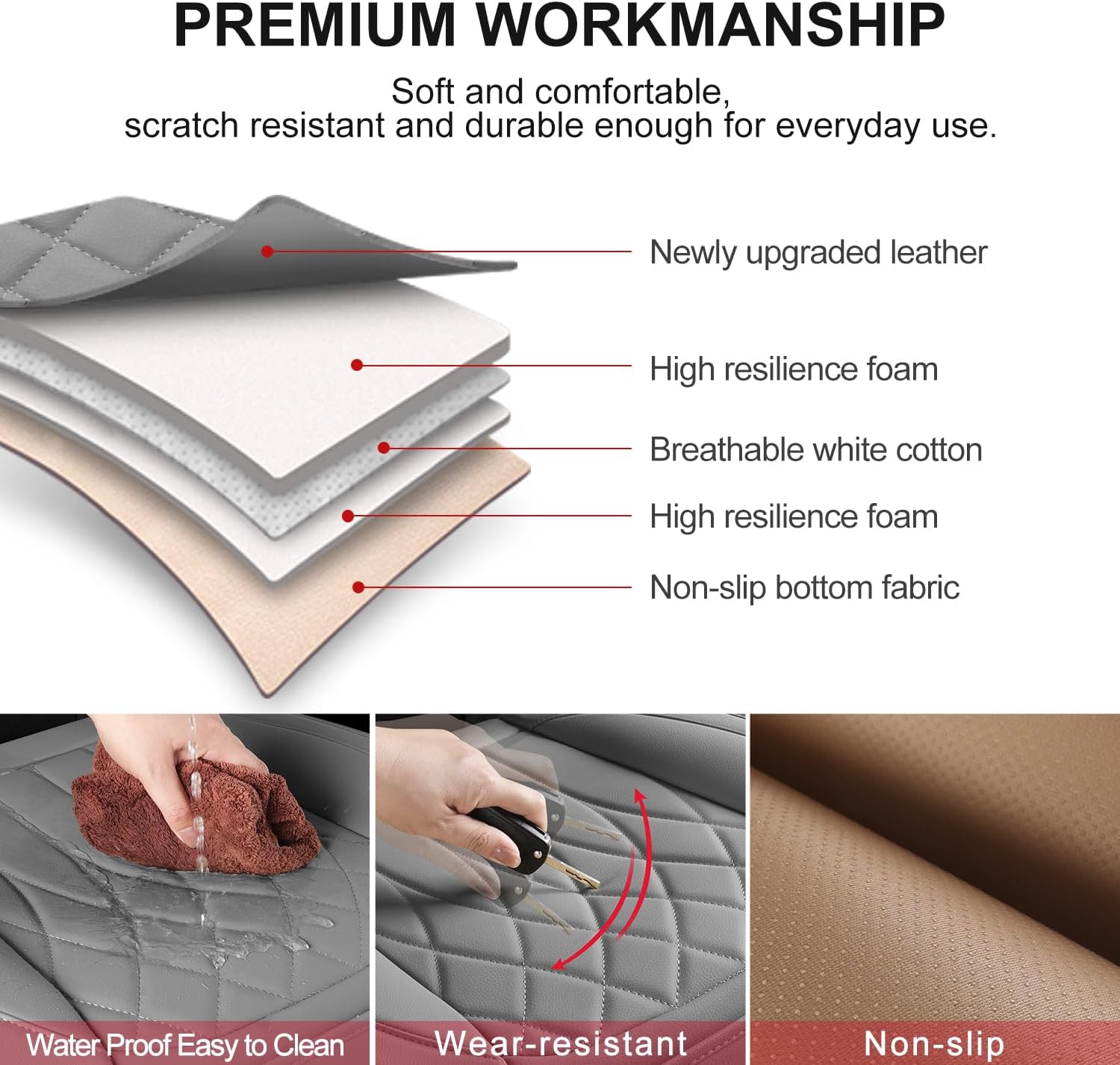 - PU Leather Soft & Durable: Our bottom seat covers for cars are made of soft PU leather, providing soft and durable protection for your car interior for long-term use. A built-in layer of elastic sponge provides maximum comfort for your hips during your driving. When the bottom car seat covers get dirty, just wipe them gently with a dry towel.