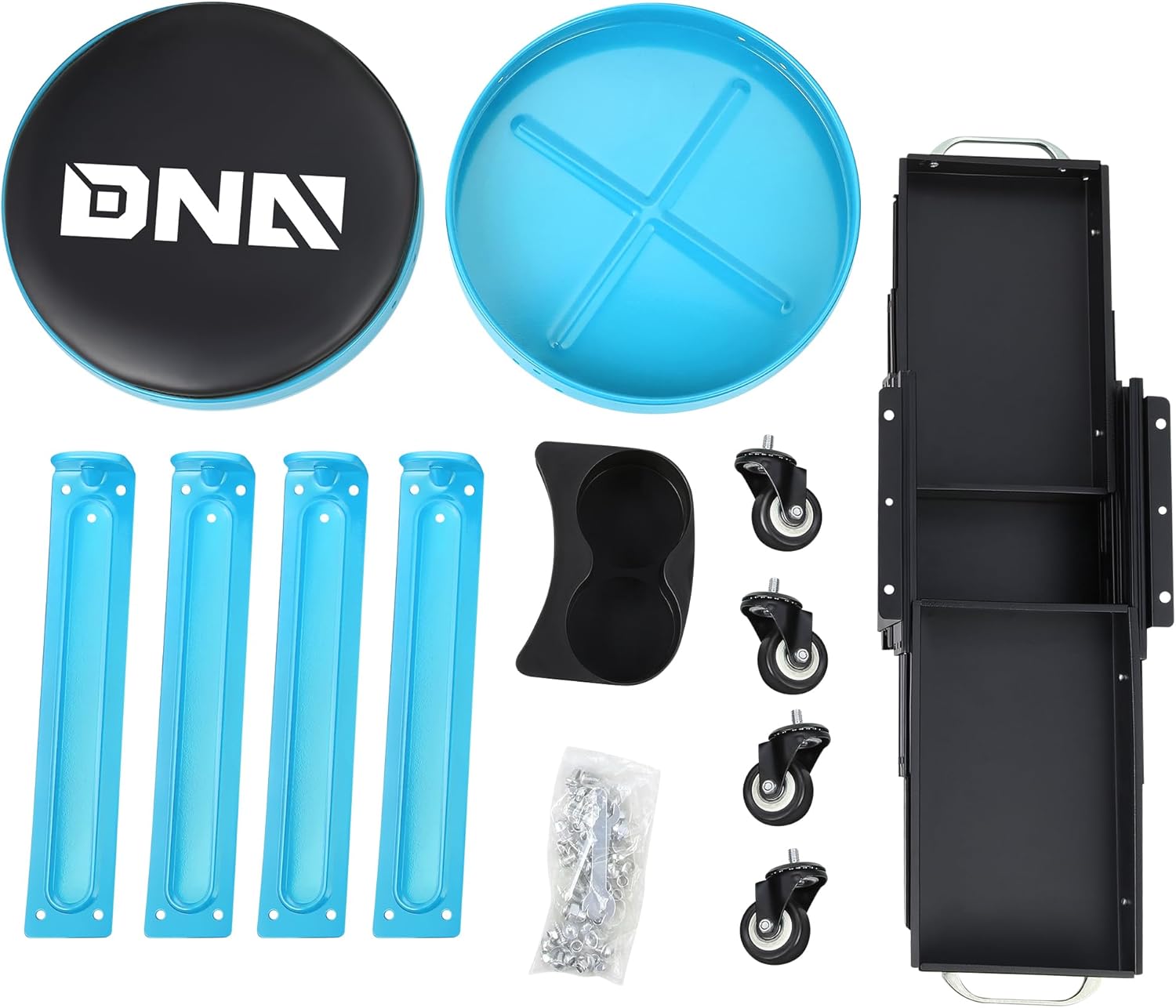 DNA MOTORING Round Mechanics Roller Seat Creeper Stool with Padded Cushion, Tool Storage Drawer & Tray, 300 Lbs Max Weight Capacity, Blue, TOOLS-00492