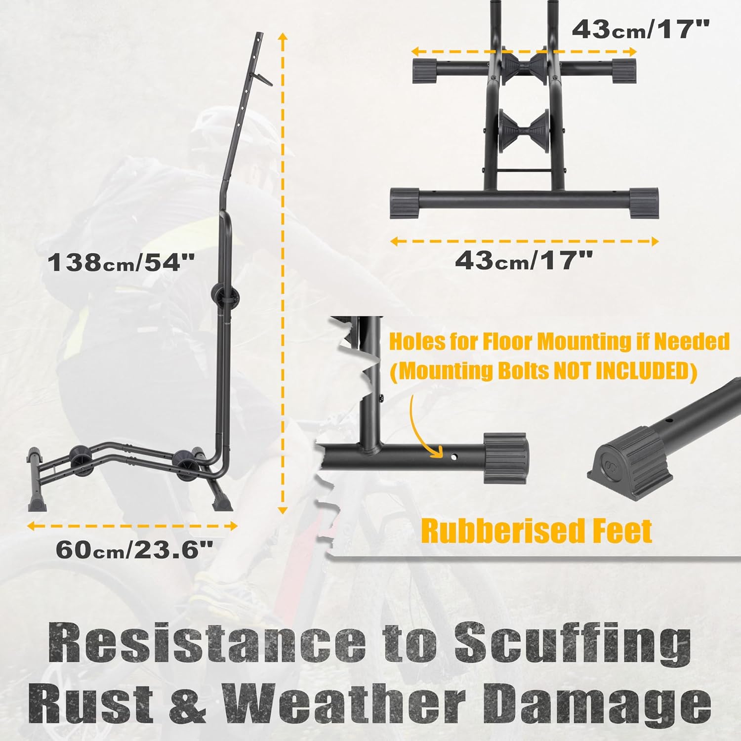- ROBUST & RELIABLE - Our bike stand ensures stability and security, with fully adjustable rollers and hooks to accommodate bikes of various sizes. The three adjustable pulleys system securely holds your bike in either an upright or horizontal position, preventing any wobbling. Plus, the rubberized feet include holes for optional floor mounting (Mounting bolts NOT INCLUDED). Its easy-to-wheel design enhances convenience and accessibility.