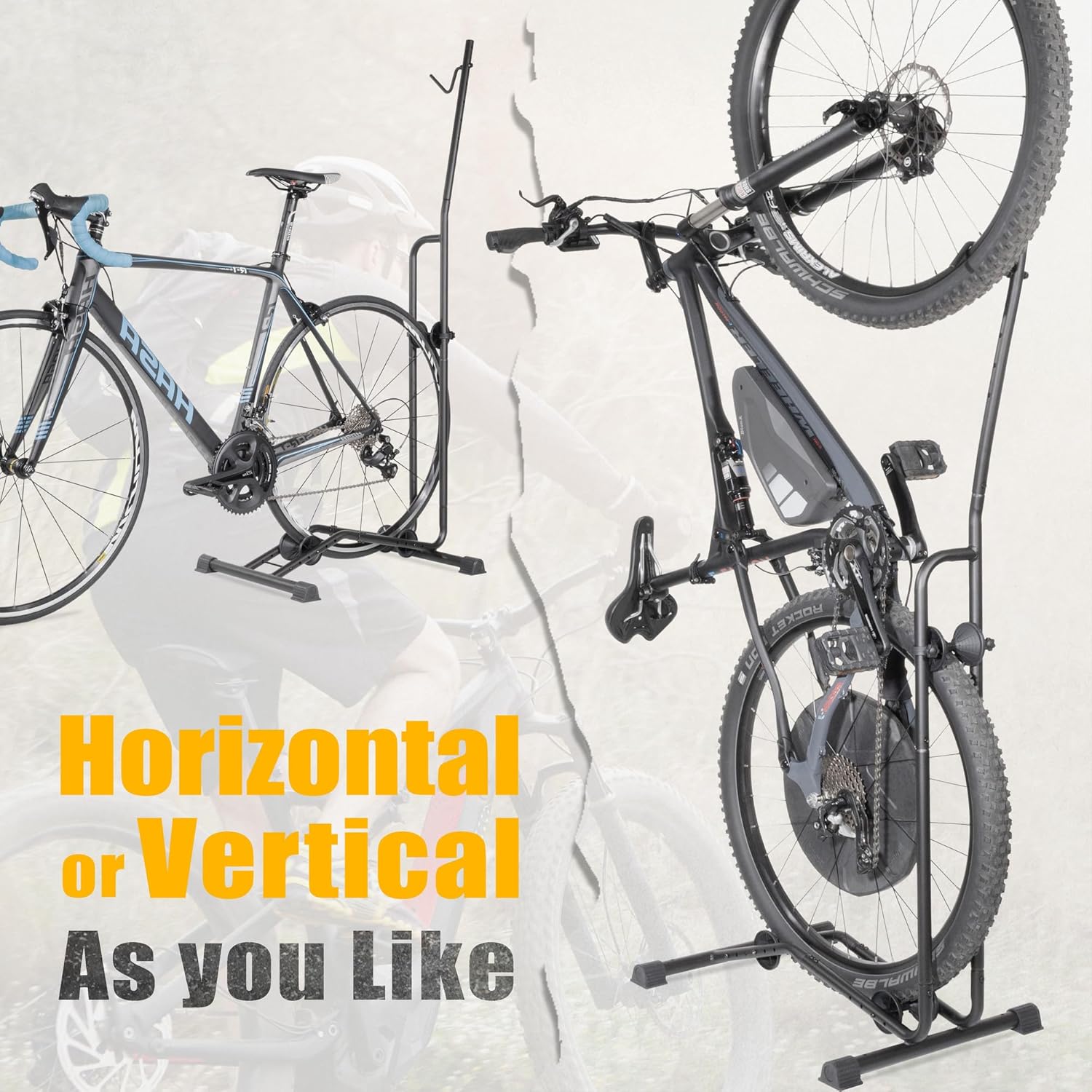 - UNIQUE 2-WAY PARKING SOLUTION - Seeking a space-saving bike storage solution? Our innovative design allows for both vertical and horizontal bike parking, maximizing floor space and organization. Experience the ease of effortlessly parking your bike in this stand, keeping your space neat and tidy. To park your bike vertically, wheel your bike in, adjust the positions of the rollers and hook, lift the bike upright, place the rear wheel in the cradle and hook the front wheel, done!