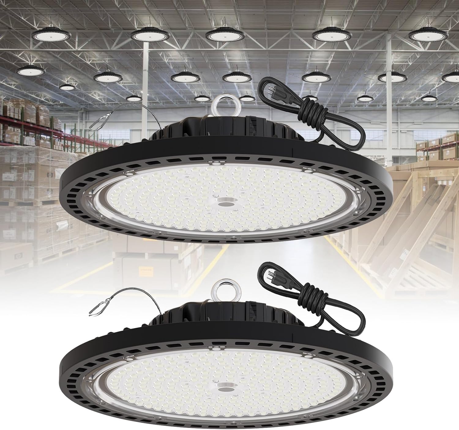 2 Pack UFO LED High Bay Light 150W, 21000 LM, 5000K with 5ft Power Cord, US Plug, Bright LED Shop Light for Basement Commercial Factory Garage Lighting, IP66 Waterproof, AC110-277V, ETL Listded