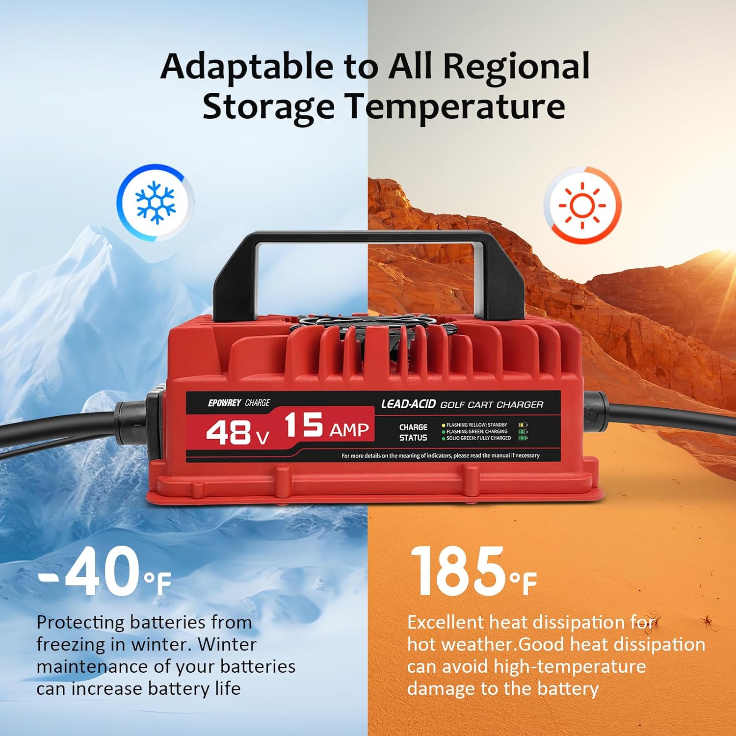 - 【15 Amp Rapid Charger/Lead-Acid】 EPOWREY 48 volt battery charger for Club Car golf carts with 3-pin round plug.This charger is designed as a one-piece plug, using a rubber cord that is more abrasion-resistant and heat-resistant than PVC cords, and have effective waterproofing advantage.
