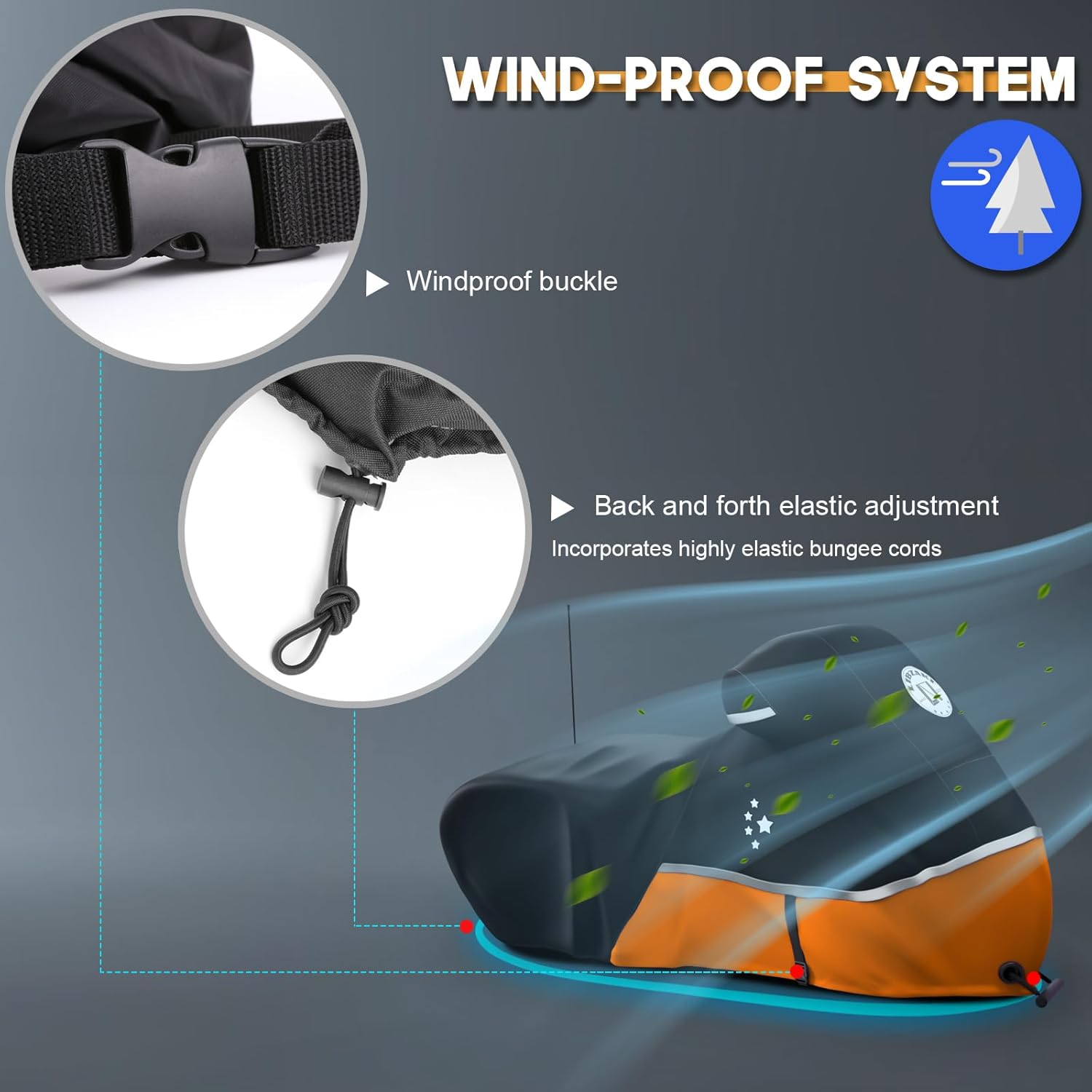 - Details Improvement : Adjustable elastic band is added to the whole circle of the bottom of the motorcycle cover, with an adjustable windproof buckle in the center, which can be adjusted to make the cover and the motorcycle tighter. In addition, the front section of the cover has an ABS lock hole.