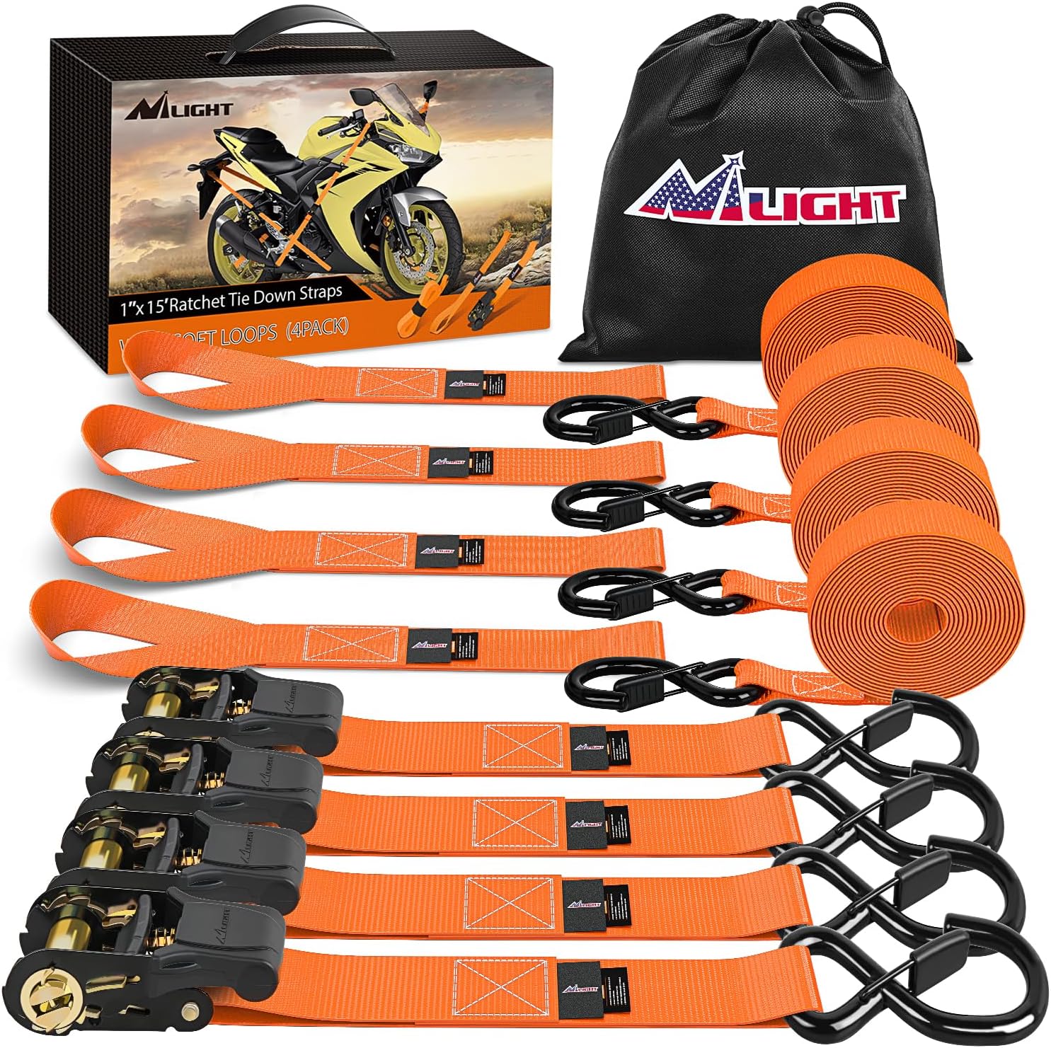 Nilight Ratchet Tie Down Straps 4500Lbs Max Break Strength 1”×15’ Heavy Duty Motorcycle Straps with S Hooks Rubber Handle and 1” ×12’ Soft Loop for UTV Motorcycle Moving Securing Cargo (Orange 4 Pack)