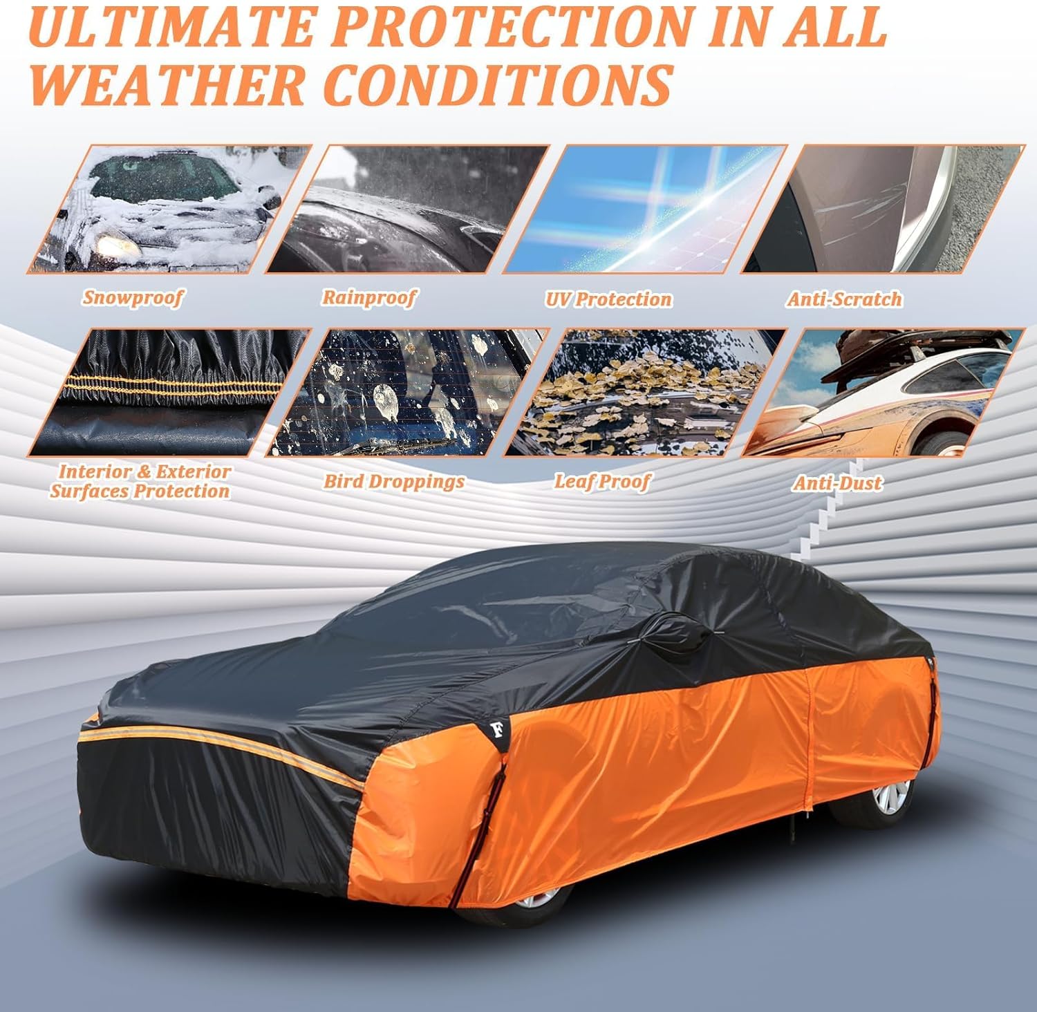 - VERIFY BEFORE PURCHASE: Please ensure your car details are correct before purchasing. Is it a sedan, hatchback, or SUV? What is the car's length? We offer a 12-month warranty. If you're unsure about the size or have any questions, feel free to reach out. We'll assist you promptly. (Our rain and snow car cover includes a portable storage bag.)