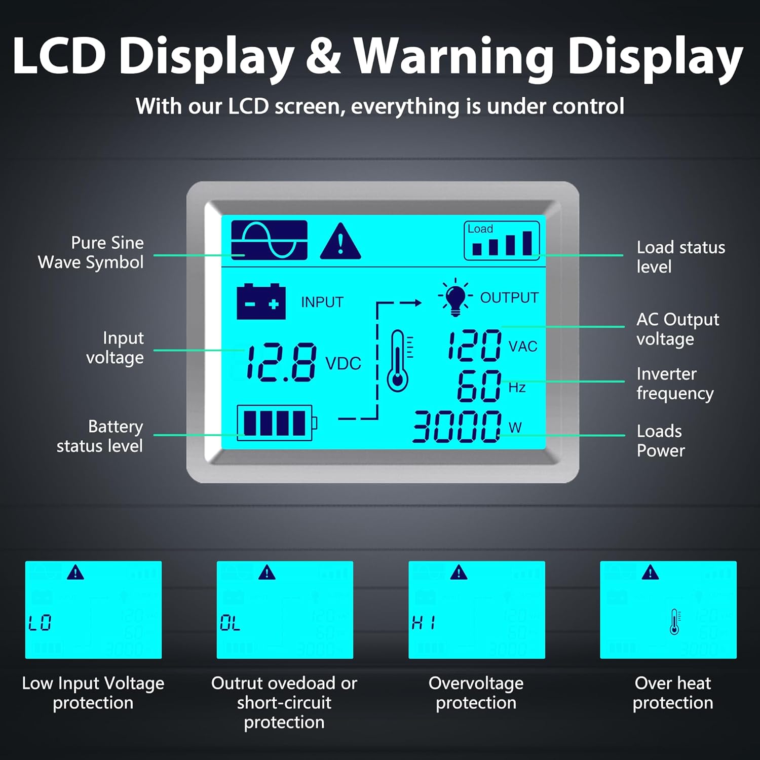 - ☎ USER-FRIENDLY DESIGN☎ The big full angel LCD screen on this 3000w inverter clearly shows input voltage, using output wattage, battery status,input voltage, and protection code to let users know informative things of the power system. Low voltage alarm automatically shut off within 1 minutes to prevent causing noise to users. The inverter coming with a 30ft wired on/off remote with battery voltage level bars to watch battery status and avoid overdischarging. Inverter temperature is readable from LCD screen.