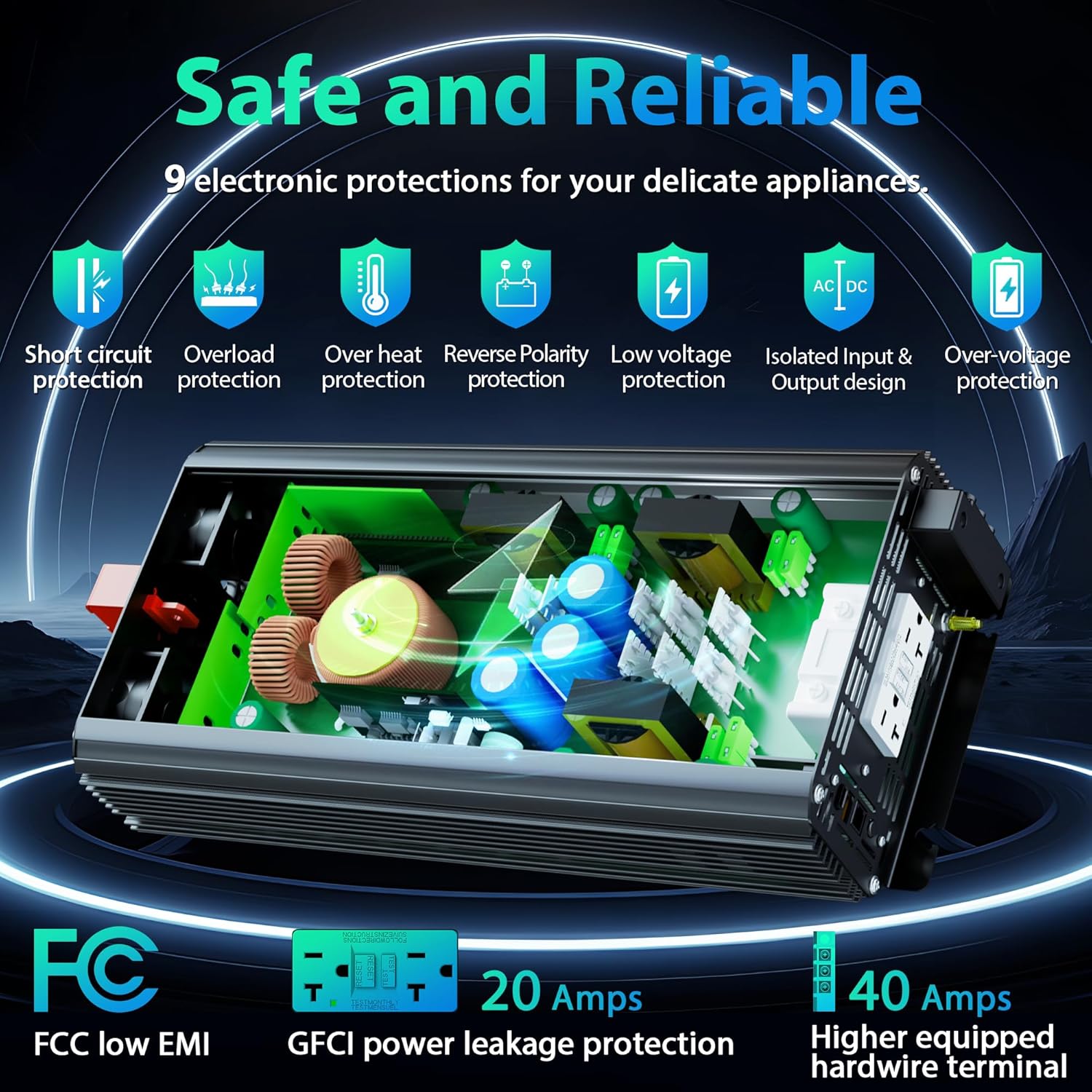 - ☎ UL approved main Components ☎ This pure sine wave inverter equipped with UL listed 20 Amps GFCI outlets,protect users from electric shock. The GFCI outlets provide ground fault circuit interrupter protection,no worries for appliances require neutral and ground bonded outlets. The main components like PCBs,built-in Fuses,Transformers also approved by UL.It is safe to install in RVs,Off-grid Solar Setup, Cars,Campers, Vessels and emergency.With full protection like Low-voltage and over-voltage protection, Over heat protection, over-load protection or short circuit,low voltage alarm.
