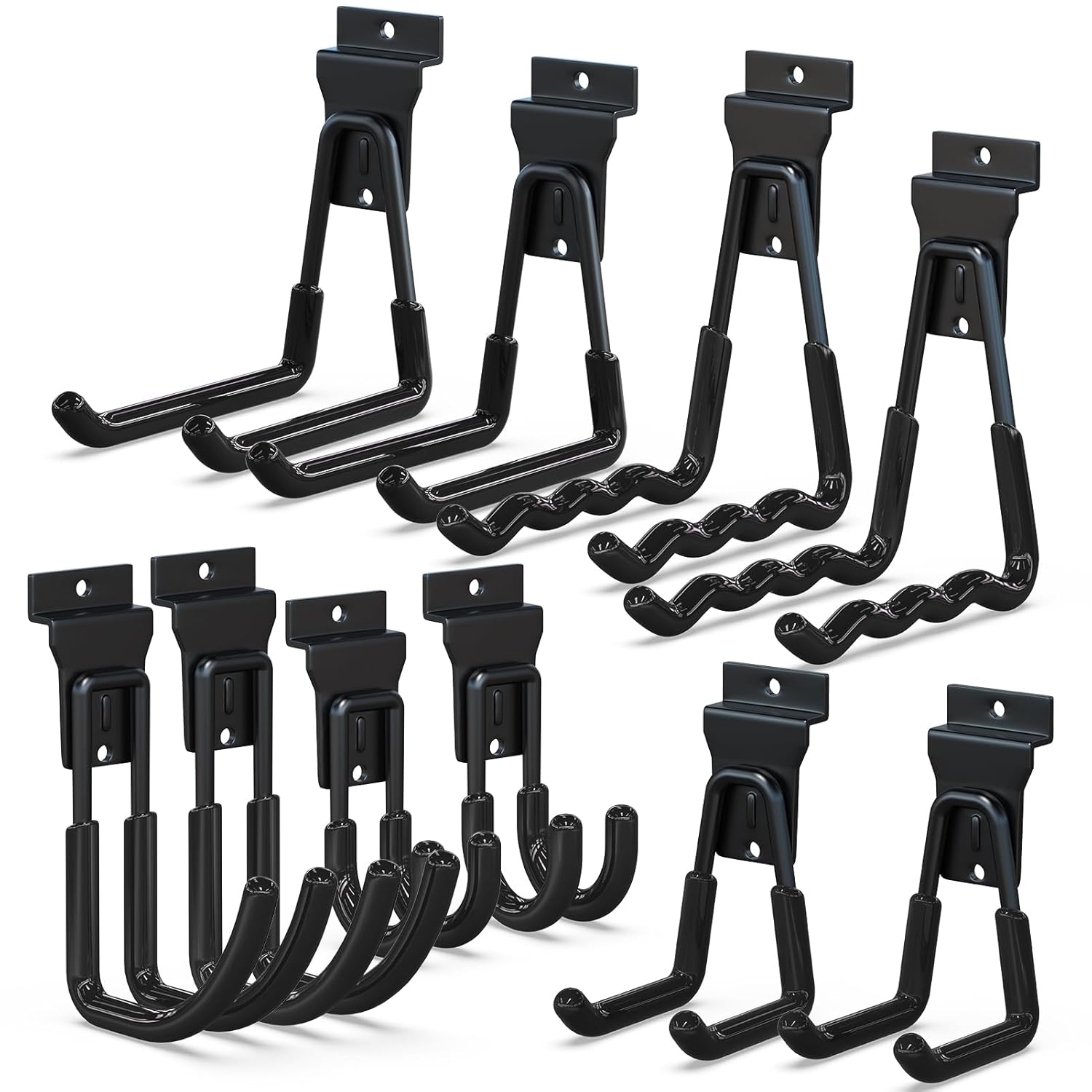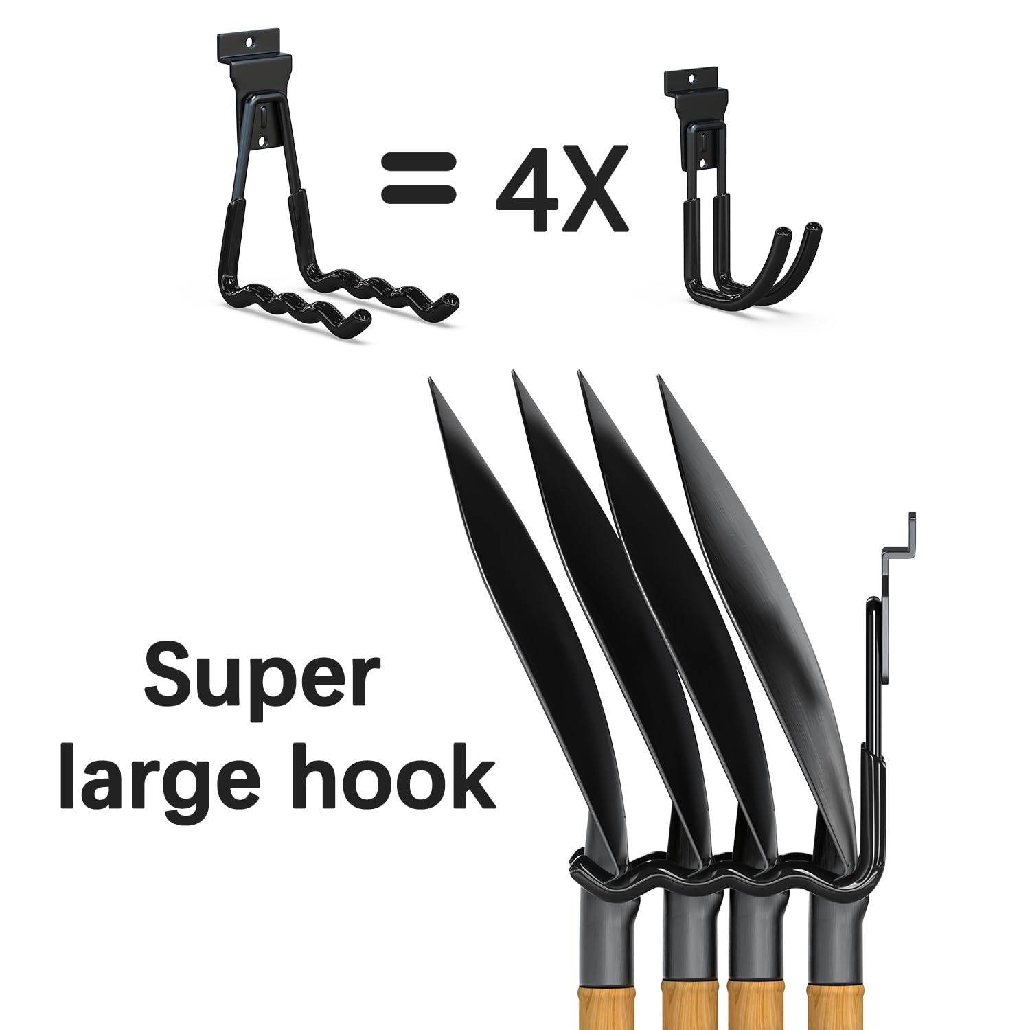 - Multi Sizes Slat Wall Hooks : 10 pack slat wall organizer in 5 different sizes, including 2 wave hooks, 2 square accessories for slat wall, 2 small square hooks, 2 large J hooks and 2 small J hooks which can accommodate different types of garden tools and equipments. Adding wave slot wall hook offers improved stability and sturdiness compared to straight hooks, can easily support more tools without worrying about items falling off or wiggling on the slatwall bike hook
