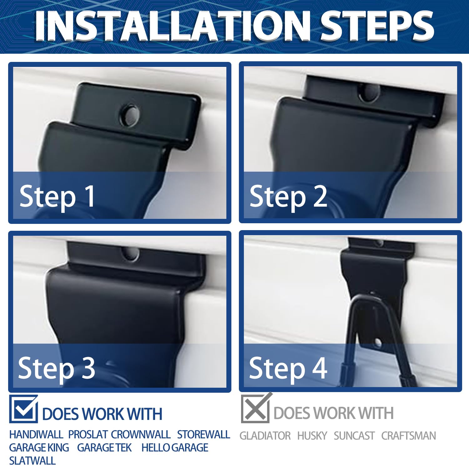 - Easy to Install and Space Saving: Slat board accessories fit standard slat wall like Proslat, Handiwall, Crownwall, etc. You can directly place storage hooks to both sides of the panel groove, fix garage hooks for hanging into the groove on the slatwall panel then press slatwall hangers down then the garage hanging hooks will fit the slat wall perfectly. Then you can move slat wall accessory to anywhere you want,saving you time and effort