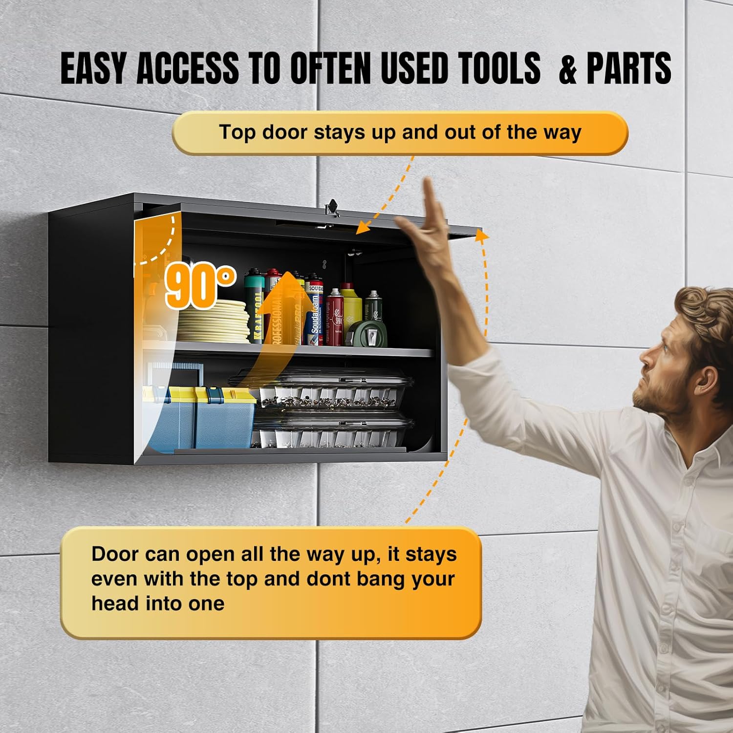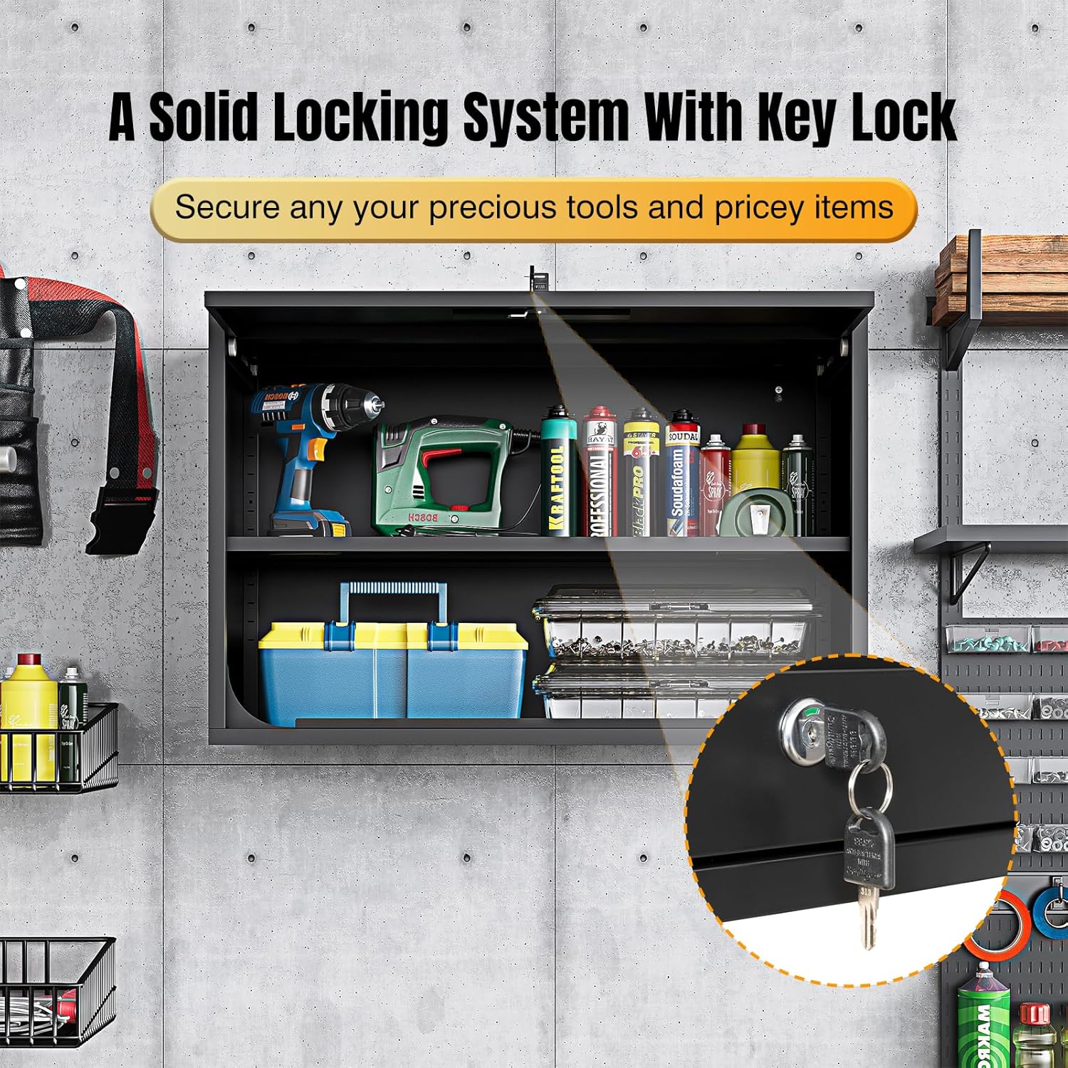 - â â€ăA solid locking systemă: This wall storage cabinet comes with a lock with 2 keys, which is a plus to secure any important and pricey items that you are storing. The lockable feature is the cherry on top, ensuring your precious tools are safe from pesky tool gnomes.