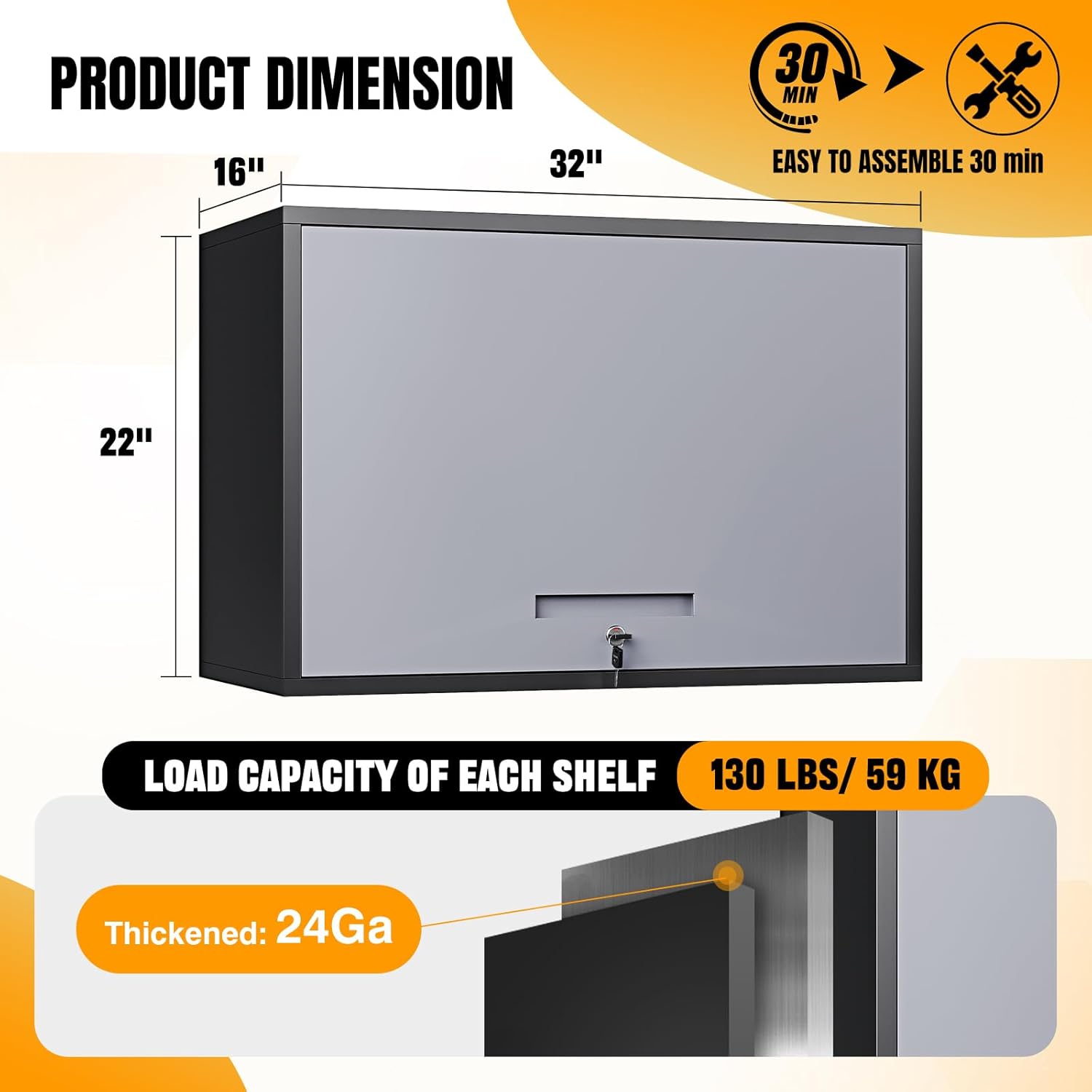 - â â€ăHigh quality wall cabinetă:The Floating Metal Garage Cabinet is made of pressed sheet metal 0.65 mm SPCC steel plate. It is sturdy, and the steel is powder coated, which helps prevent rust. The robust steel construction can support up to 130 lbs for each shelf.