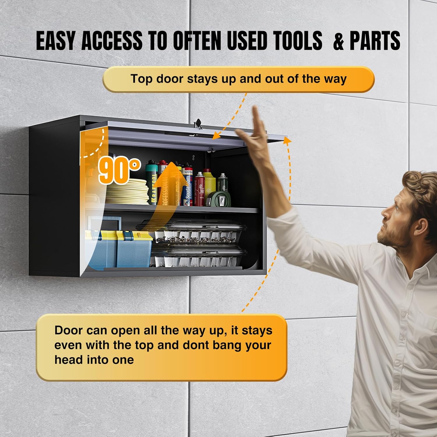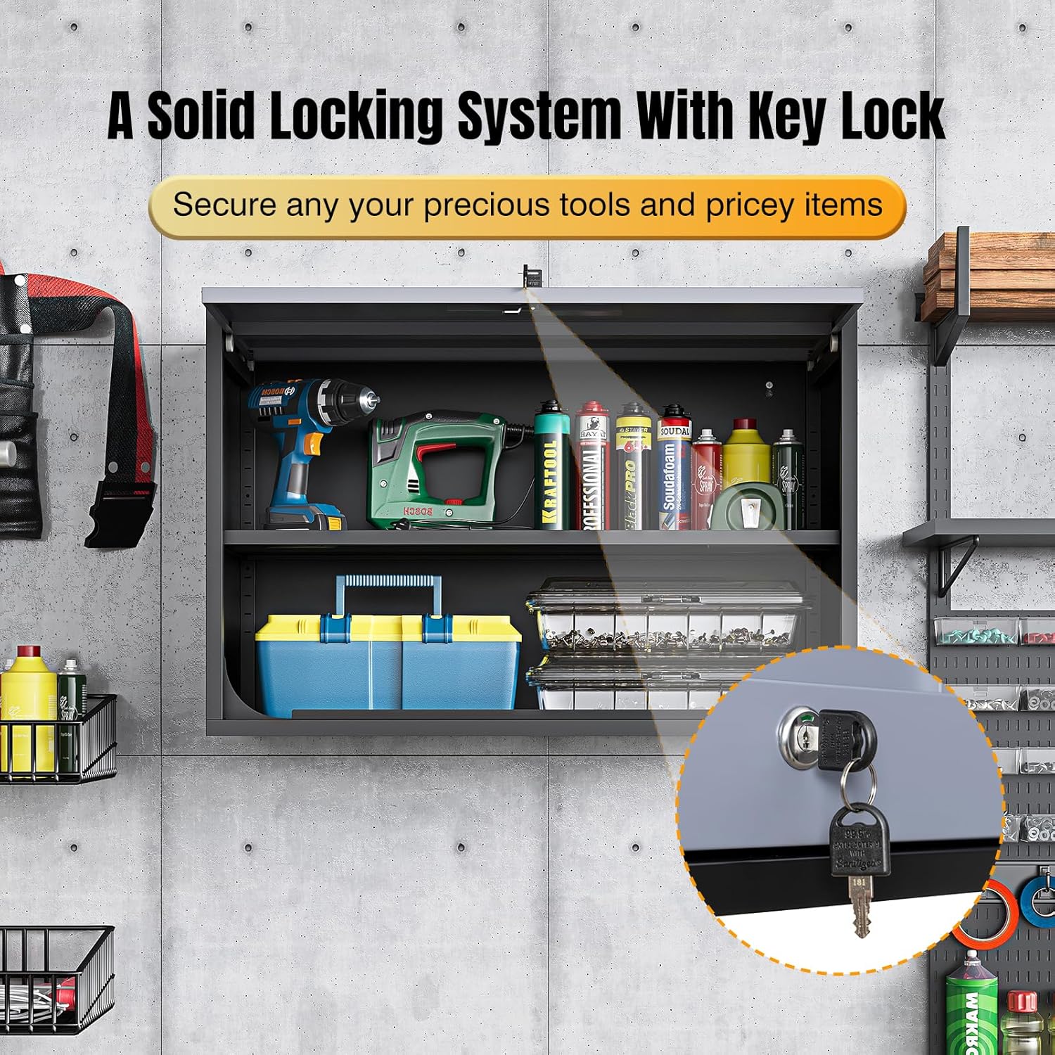 - â â€ăA solid locking systemă: This wall storage cabinet comes with a lock with 2 keys, which is a plus to secure any important and pricey items that you are storing. The lockable feature is the cherry on top, ensuring your precious tools are safe from pesky tool gnomes.