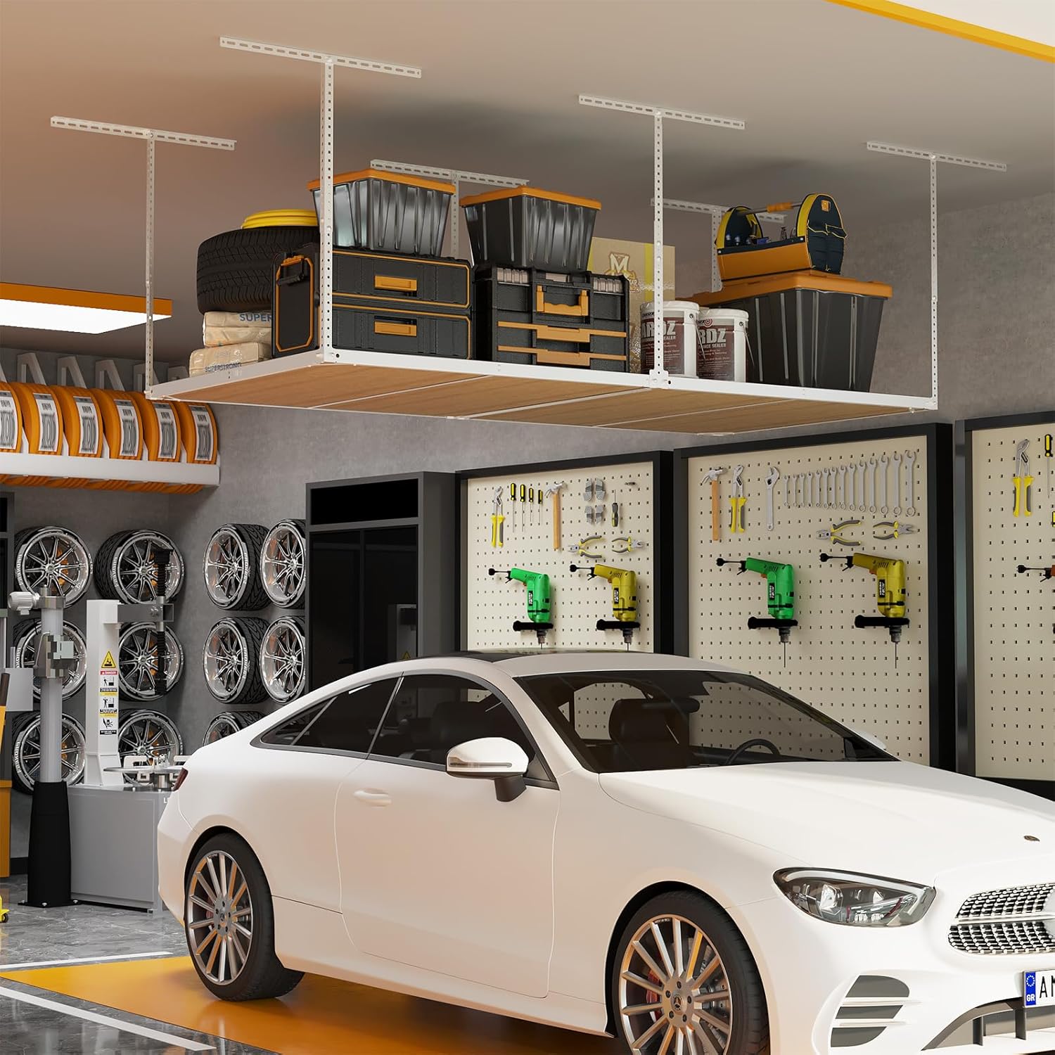 4x8ft Overhead Garage Storage Rack Wooden Decking Not Included, Heavy Duty Metal Rack, Adjustable Ceiling Dropdown, 600lbs Weight Capacity (White)