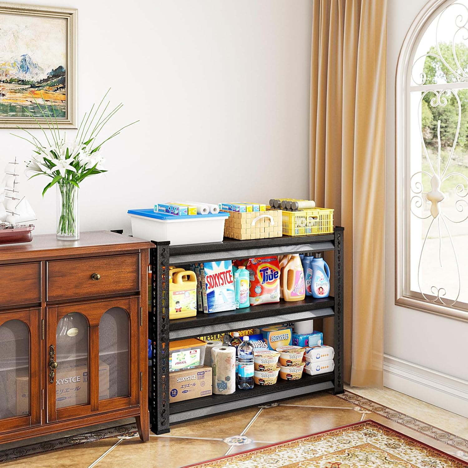 - ăSafeïŒRust-ProofăThe entire all-metal shelves are locked by pins to ensure crossbeams stay seated and 4 support straps to prevent twisting or spreading. The powder-coated finish on the steel uprights, support straps, and crossbeams, easy to clean, moisture-proof and rust-proof.
