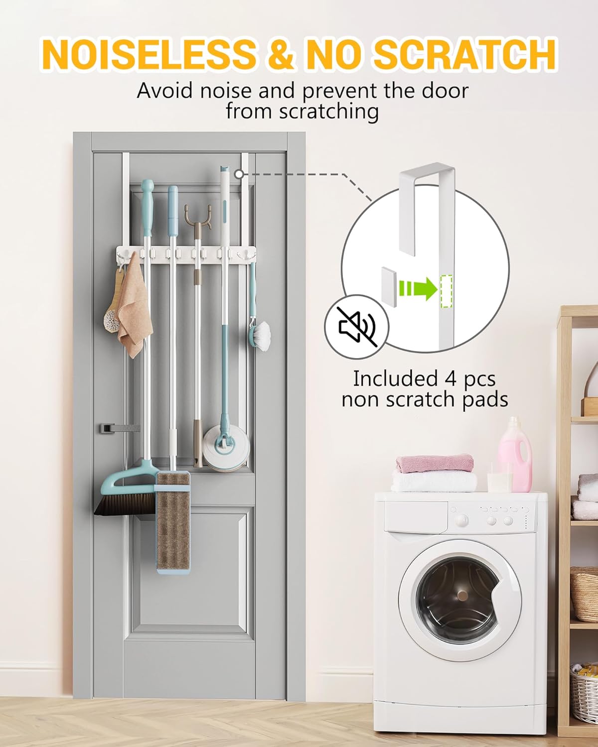 - Wide Range of Uses, Ideal Gift: Step away from traditional broom holder door mount. Simply place door broom holder organizer over the door. Our over the door broom and mop holder maximizes space without compromising style, effortlessly organizing brooms, mops, towels, and brushes in the laundry room, garage, bathroom or kitchen. With its aesthetic appeal and practicality, it's a thoughtful gift for occasions like Father's Day, Mother's Day, or for husband, wife and grandparents.