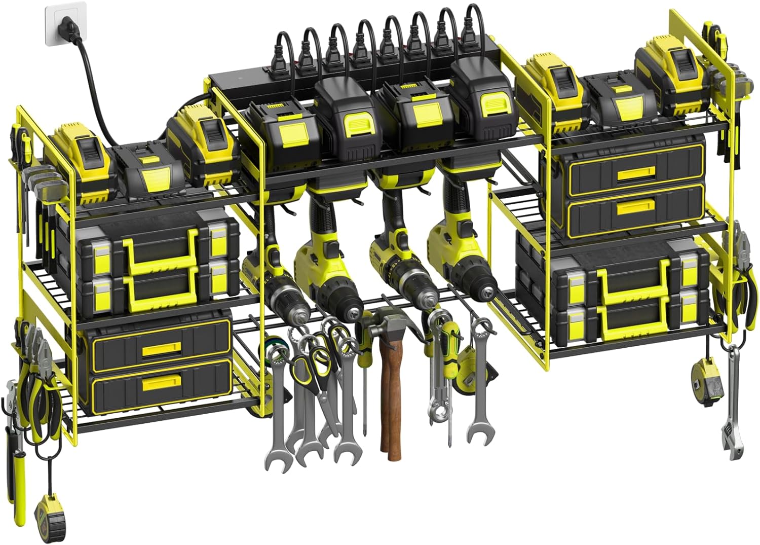 - Green wall mount power tools organizer with individual switches 8 outlets power strip, lager size, 8 slots, 8 hooks, and 4 side tool organizer, 3 layer 7 tools shelves, can keep rechargeable tools organized in the work area and save your bench space and easy to store your frequently used tools together.