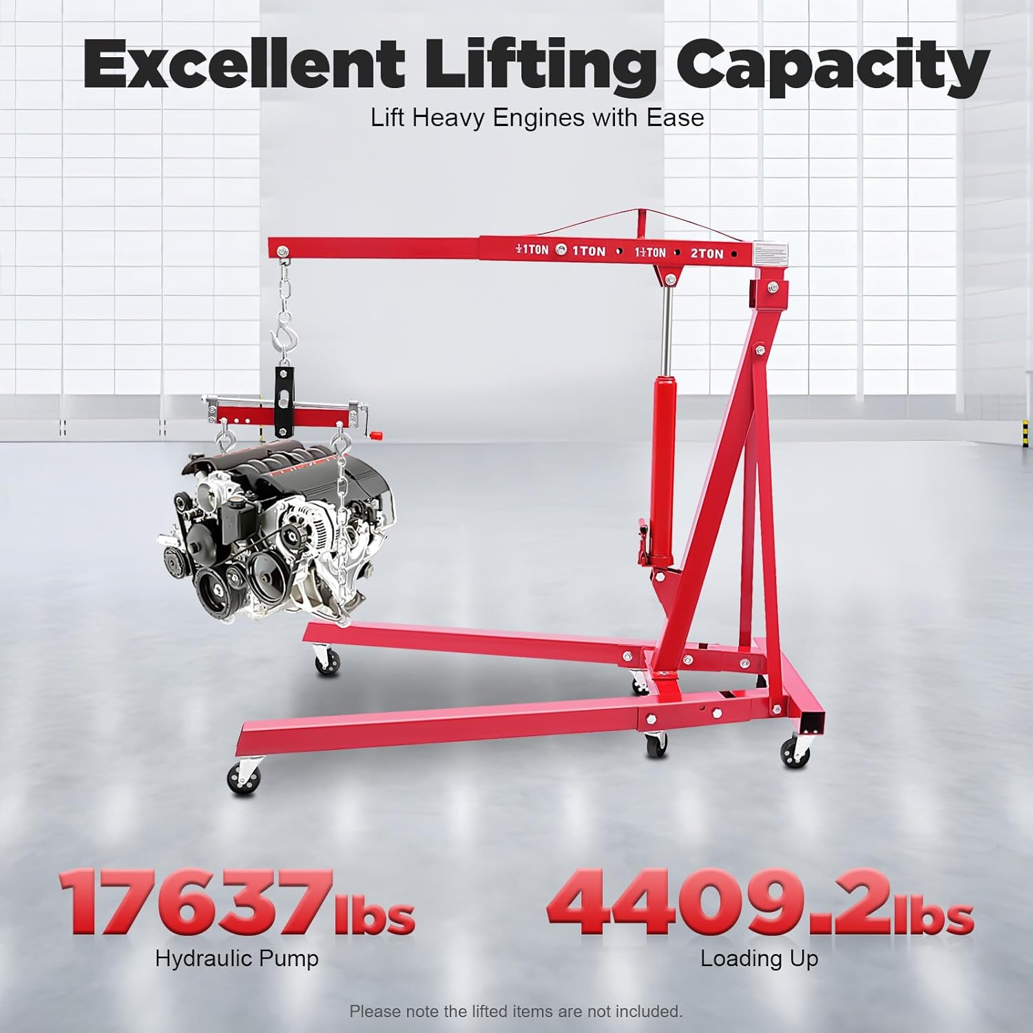 LOYALHEARTDY Engine Hoist with Lever, 2 Ton 4400 LBS Folding Cherry Picker Shop Crane Hoist Lift, Heavy Duty Hydraulic Engine Crane with 6 Casters, Engine Lift Hoist Lever for Engine Lifting Loading