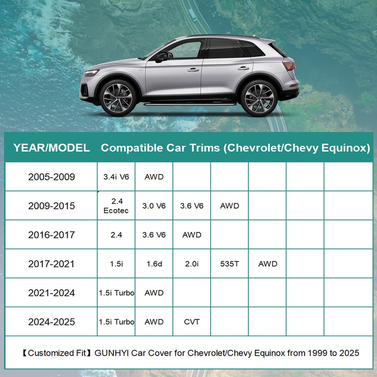 - Coverage : Full exterior coverage for Chevrolet Equinox (2005-2024)