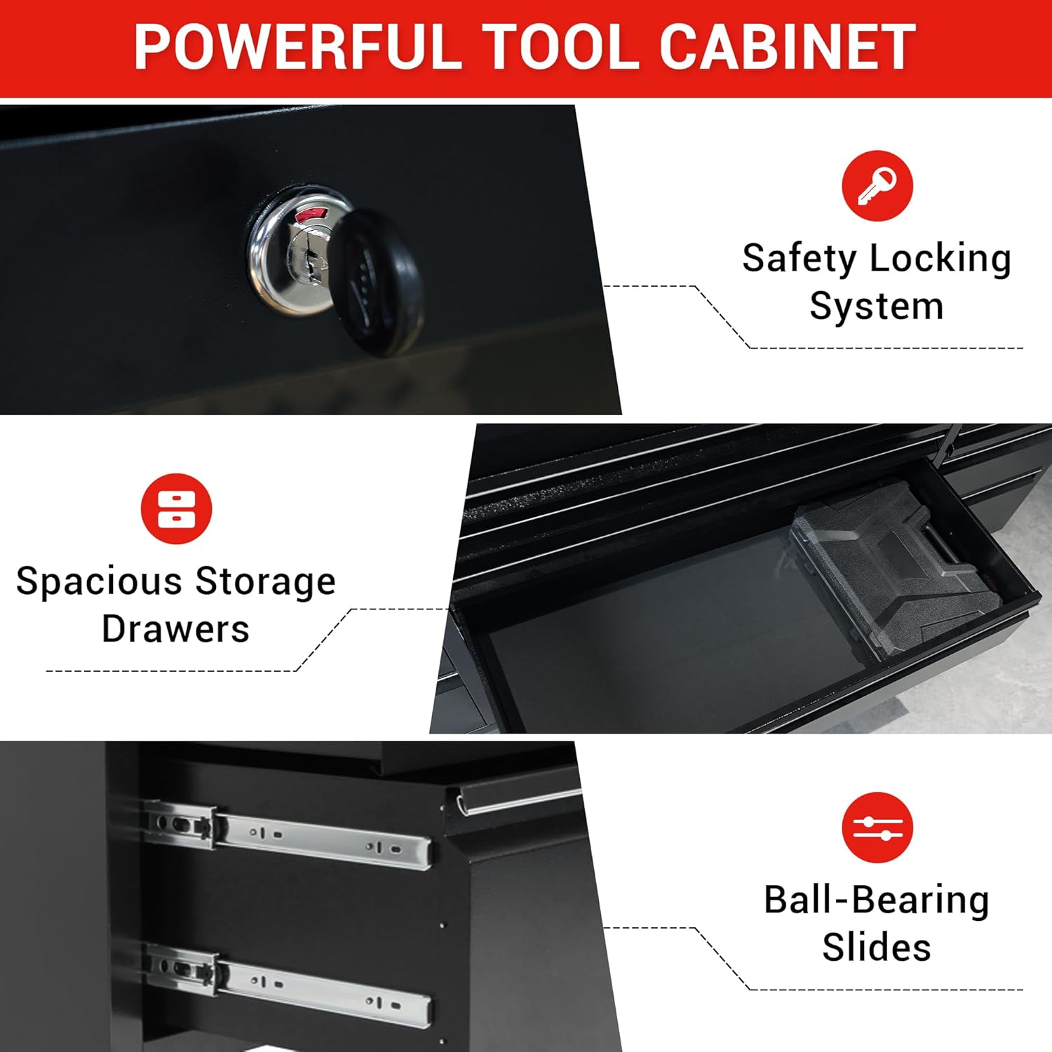 - USER-FRIENDLY DESIGN: Each of the drawers comes with sliders that allow smooth and easy operation as well as 100 lbs load capacity. This tool chest with drawers includes pre-cut drawer liners that keep tools from sliding around when opening and closing the drawers.It comes with a flat key locking system to secures all drawers.
