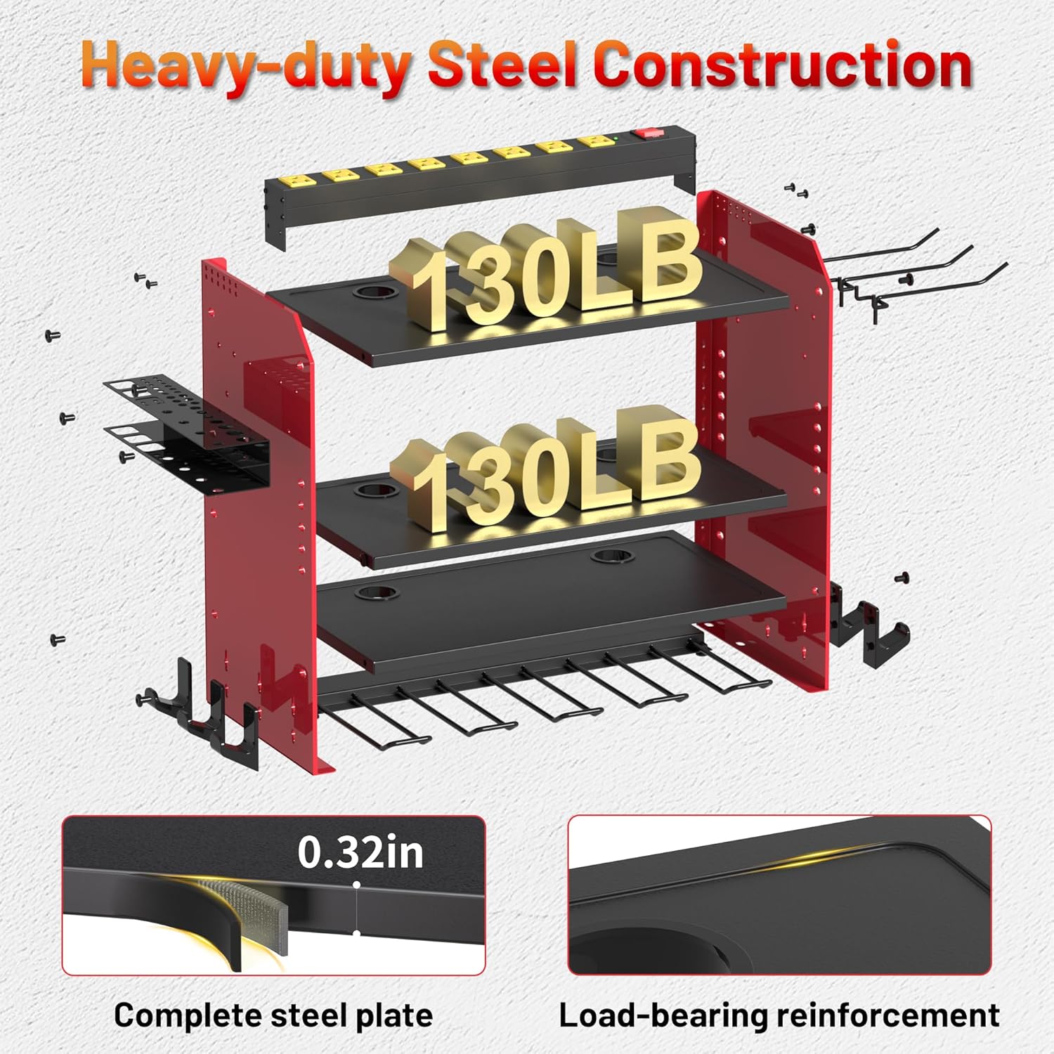 - Ssfe Charging Station--8 outlets power strip for power tool organizer solves the power needs,with 125V/15A/1875W,6ft power cord and 2100J surge protection to protect power equipment;Drill holes in single-layer boards to solve power cord clutter problems