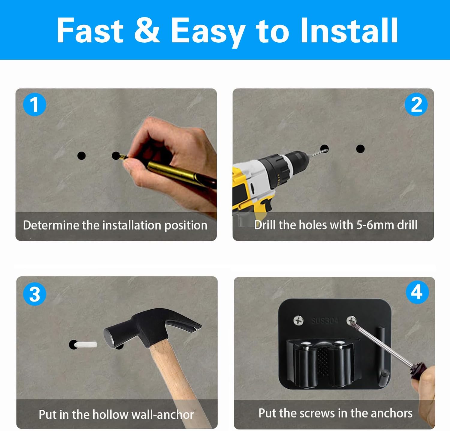 - [EASY TO INSTALL & USE] - Comes with all the screws and wall anchors necessary to attach broom rack to drywall. Installation is pretty simple and took less than five minutes. Suitable for weighty or outdoor hanging. It is easy to use. Just push the mop or broom handle into the clamps after finish your household cleaning. Our mop holder can stand up to 15 KG, more strong and sturdy than the plastic or wooden holder.