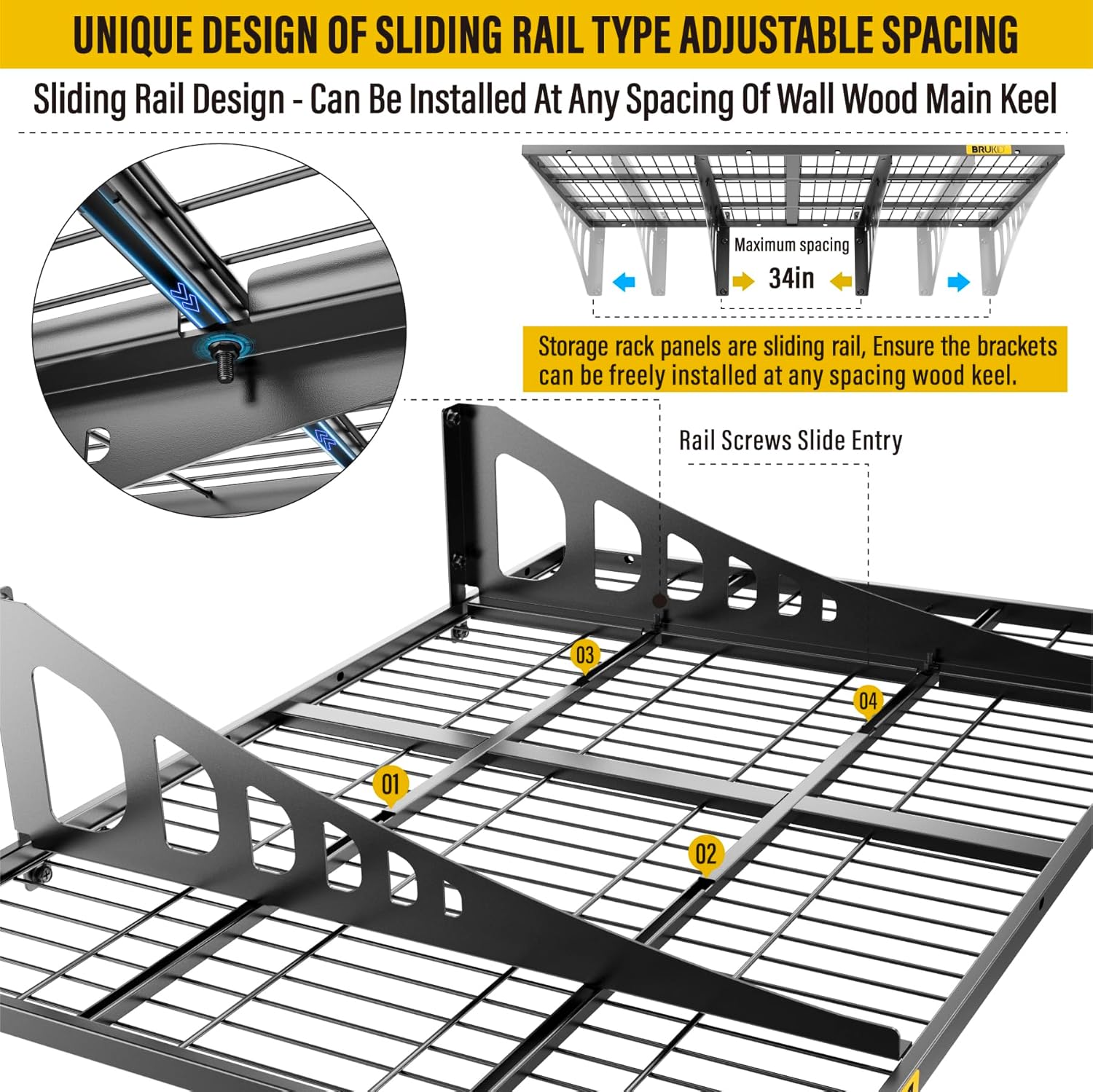 - SUPERIOR DESIGN: Wall shelf garage storage rack is made of heavy-duty frame structure and thicker wire mesh combined with welding, the panel and bracket connection is adjustable slide rail design, Both ends of the bracket can be installed freely in the 8"-45" range of wood wall keel spacing. Eliminating the worry of not being able to connect due to the mismatch of the spacing of the load-bearing wooden wall keel.