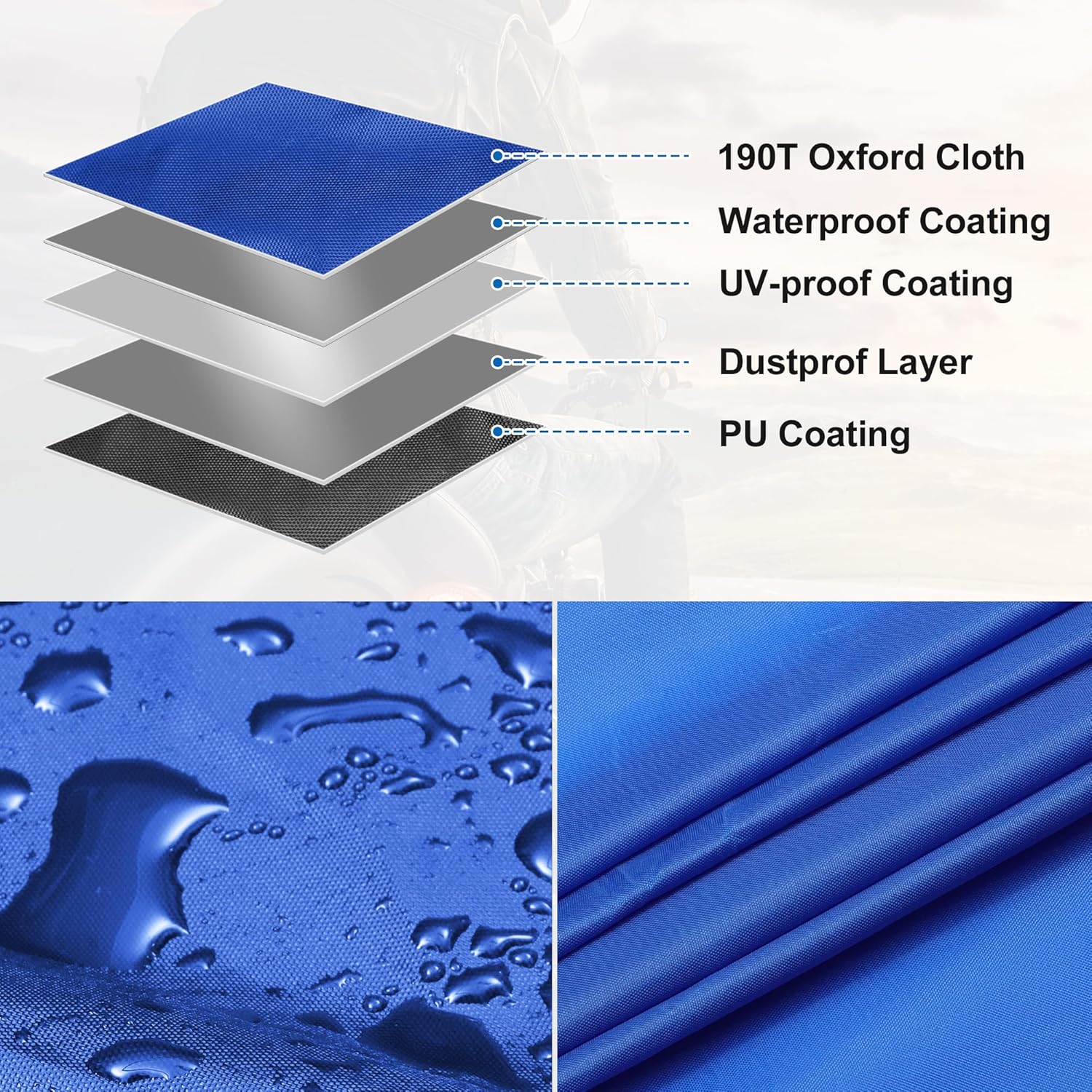 - Waterproof Windproof Upgrade: The motorcycle cover is made from 190T polyester, with the seam applied with PU glue, so it is rainstorm-proof. Adjustable Elastic Band at the lower hem of the cover can press the cover against the motorcycle body closely. In addition, there is a buckle at the bottom to prevent the cover from being blown away.