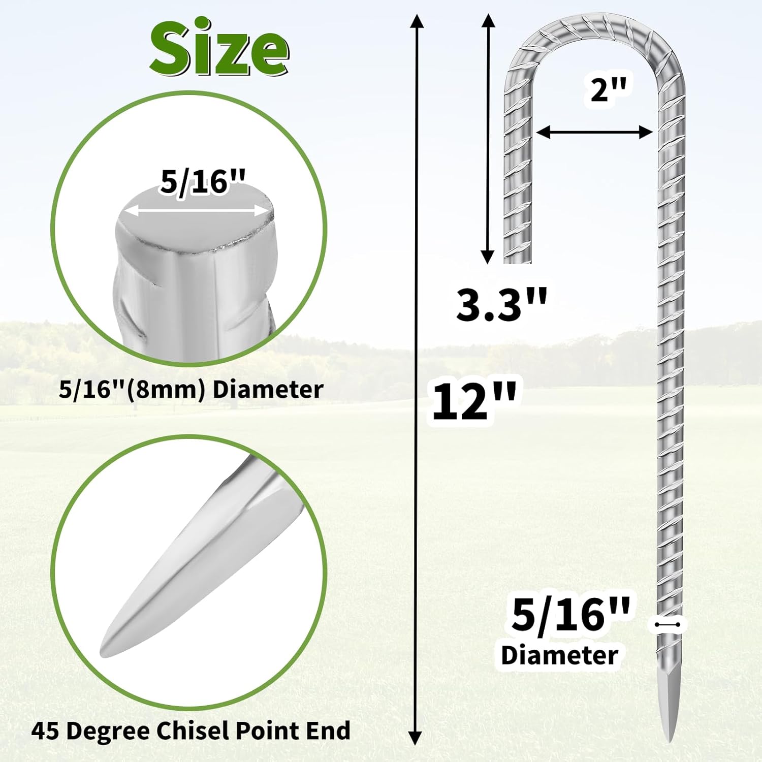 - 【12 Inches Rebar Stakes】Sold in bundles of 30 pieces. 12 inches length from tip to hook, 5/16 inch (8mm) diameter j stakes. The hook is 3.3" and spacing is 2", pefect for chain link fence, holding outdoor decorations, greenhouse, canopies, gazebos and giant inflatables etc.