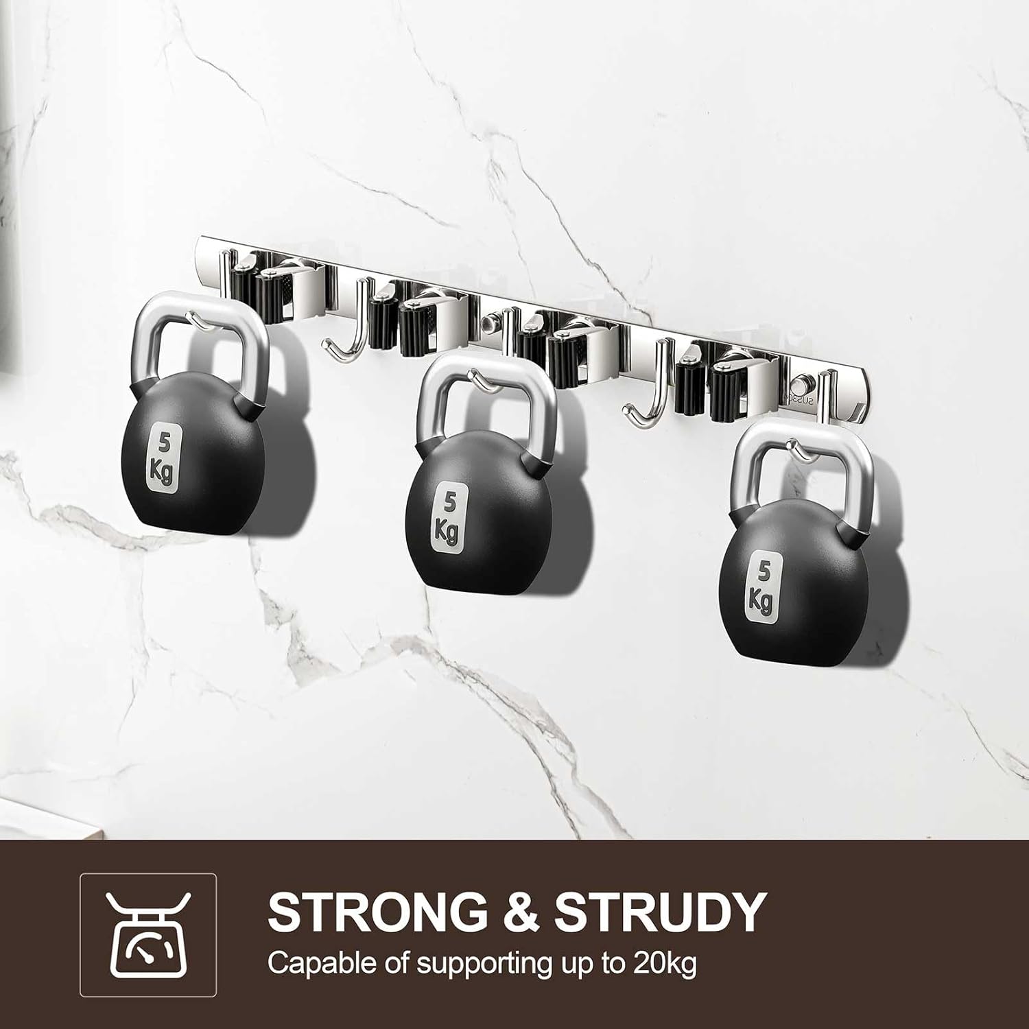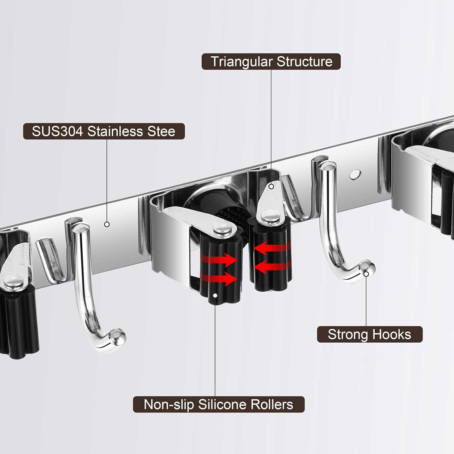 - STURDY & NON-SLIP DESIGN: Our broom and mop holder wall mount is constructed from rustproof stainless steel, offering greater durability than plastic options. It can support up to 44 lbs with screws (or 22 lbs with self-adhesive). The integrated anti-slip silicone prevents scratches and ensures a strong grip, thanks to the double rubber-gripped slots