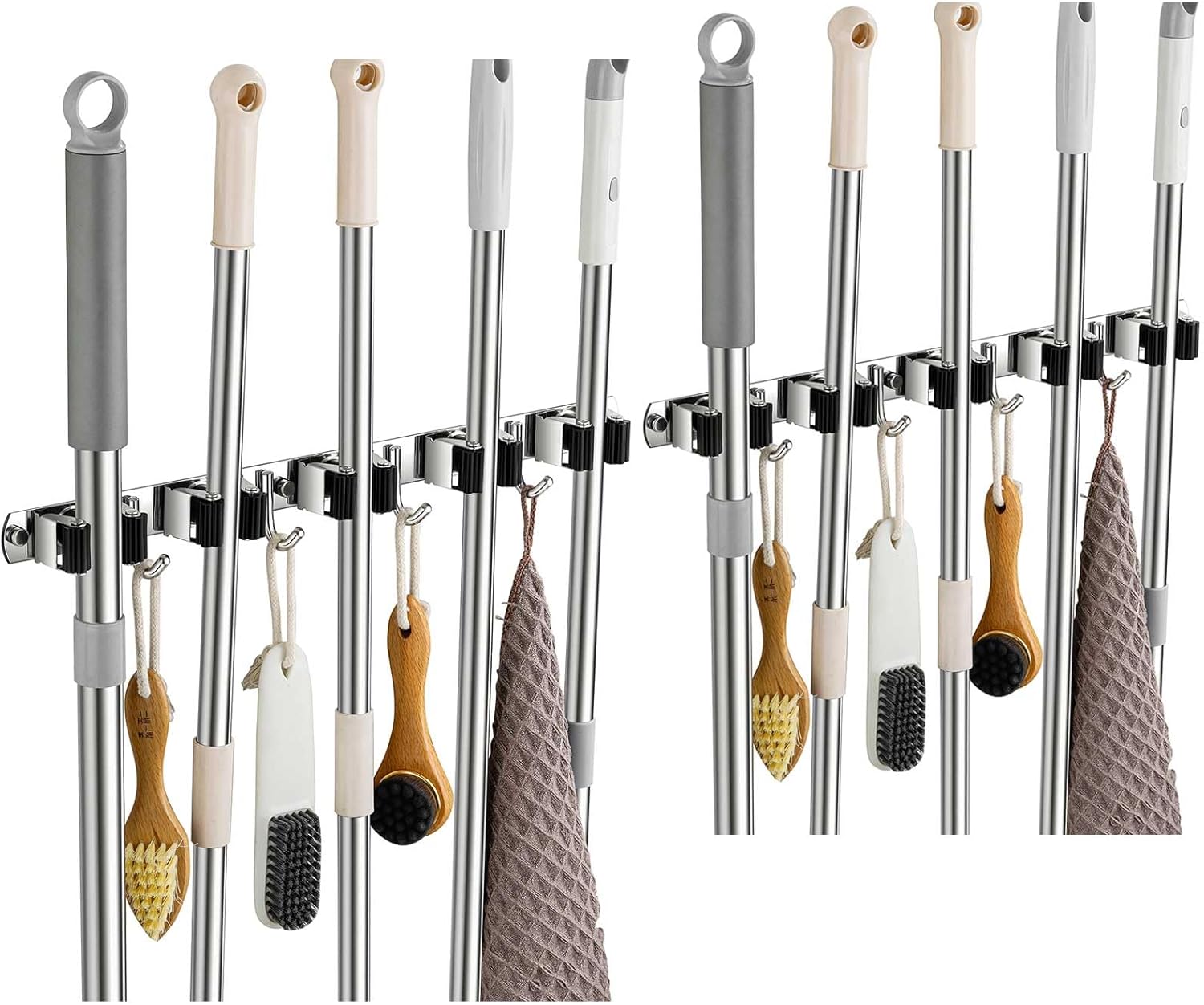 - ORGANIZE & SAVE SPACE: Featuring 5 racks and 4 hooks, this broom and mop organizer optimizes wall space, keeping your tools neatly arranged and easily accessible. It's ideal for brooms, mops, rakes, garden tools, and more, ensuring your garage, kitchen, bathroom, or laundry room stays clutter-free. The extra hooks provide additional hanging space for various items