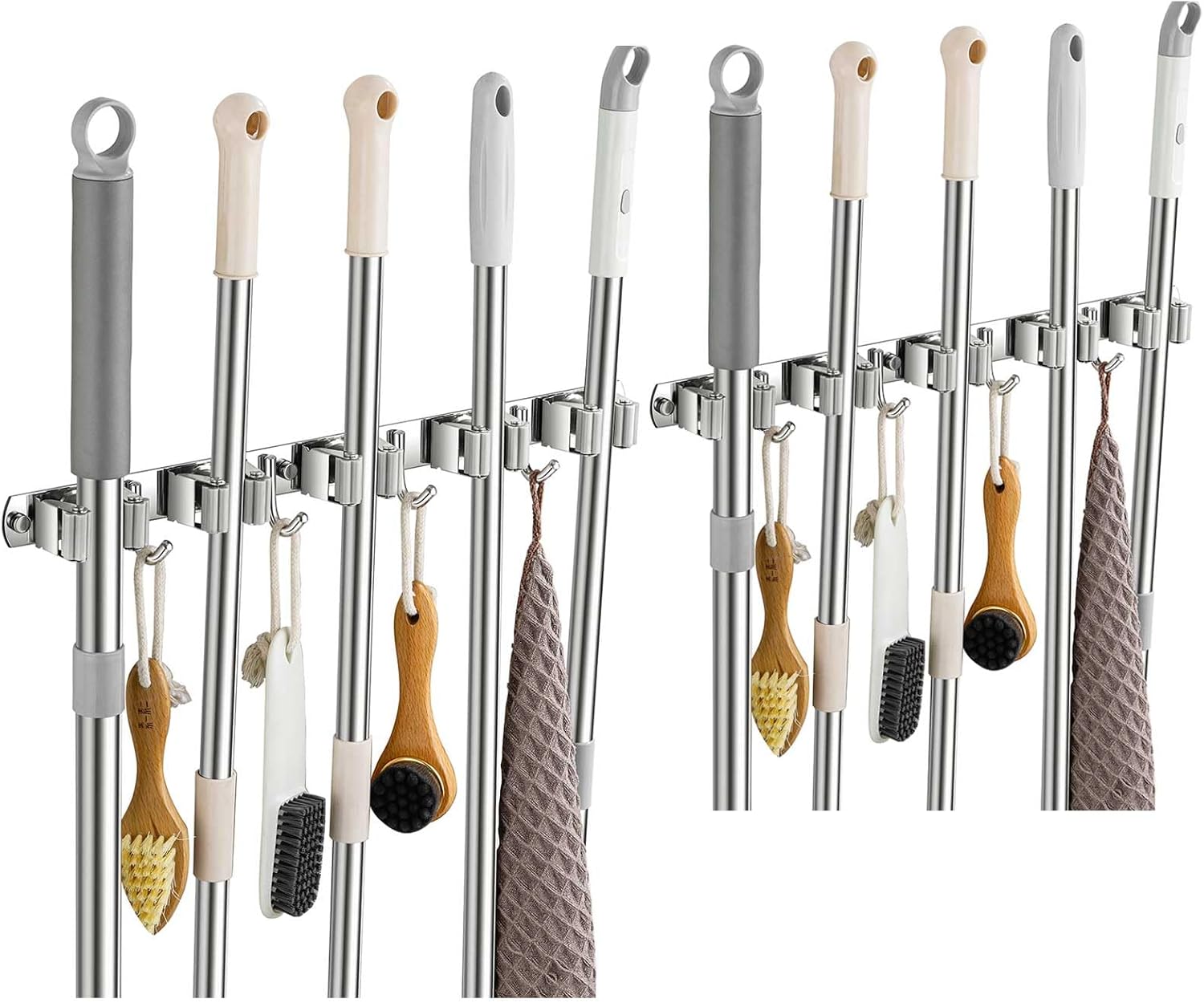 - STURDY & NON-SLIP DESIGN: Our broom and mop holder wall mount is constructed from rustproof stainless steel, offering greater durability than plastic options. It can support up to 44 lbs with screws (or 22 lbs with self-adhesive). The integrated anti-slip silicone prevents scratches and ensures a strong grip, thanks to the double rubber-gripped slots.