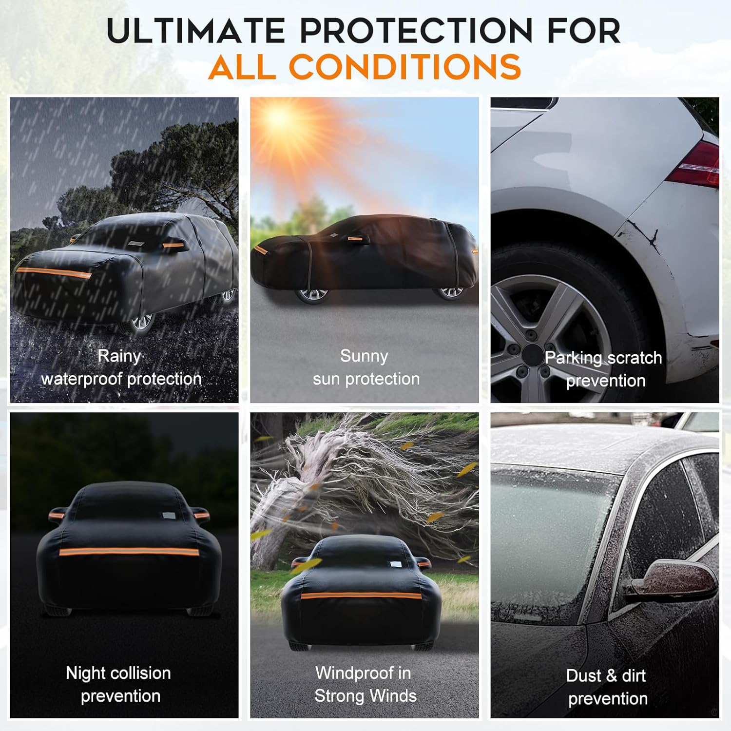- All-Season Defense: Built for extreme conditions, this car snow cover defends against torrential rain, snowstorms, and scorching sun, making it a top choice for car covers for automobiles in harsh climates.