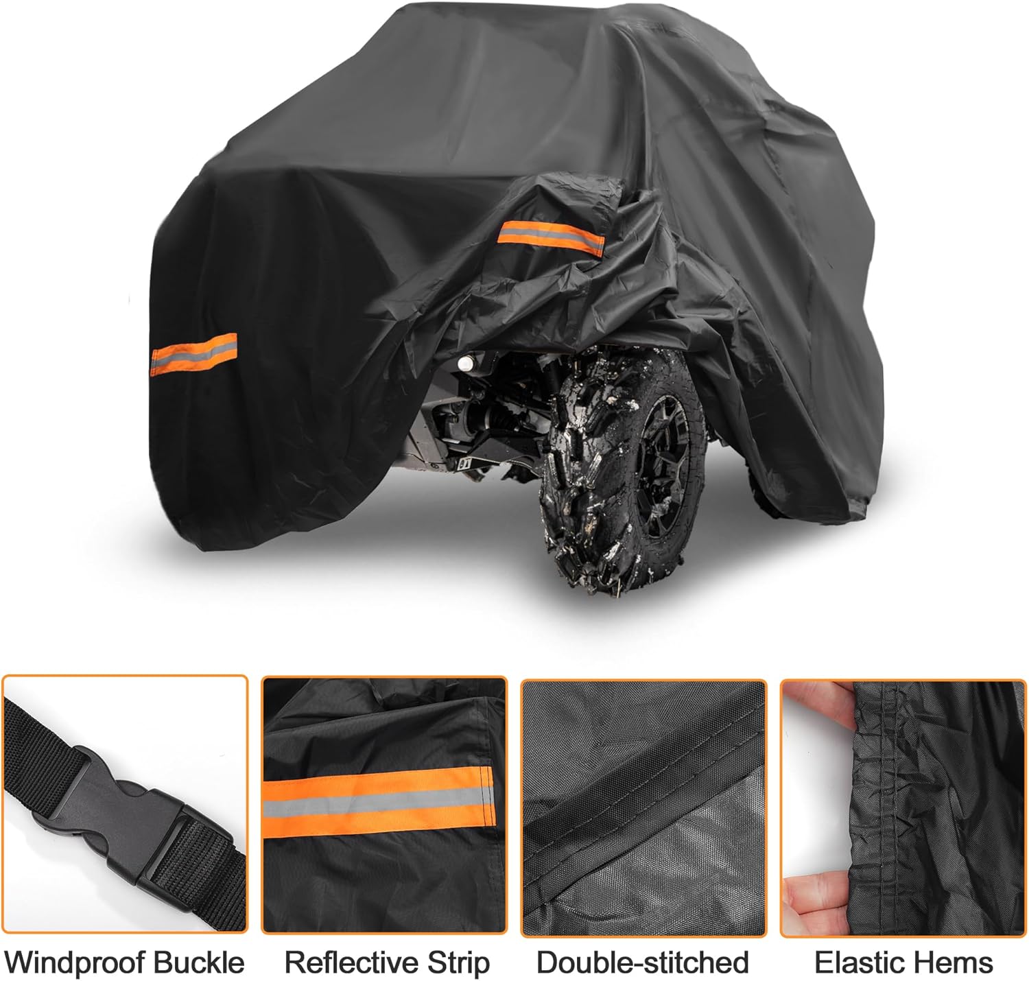 - Windproof Design: 1 - There are windproof buckle straps on the front and back of the bottom and you can be adjusted according to the size of the ATV body. 2 - The front and rear wheels are sewn to elastic bands to closely fit the ATV body, prevent the cover from being blown away by strong winds. Note: Our cover has a direction, the"Front" mark can help you quickly find the ATV's head, to install the four wheelers cover.