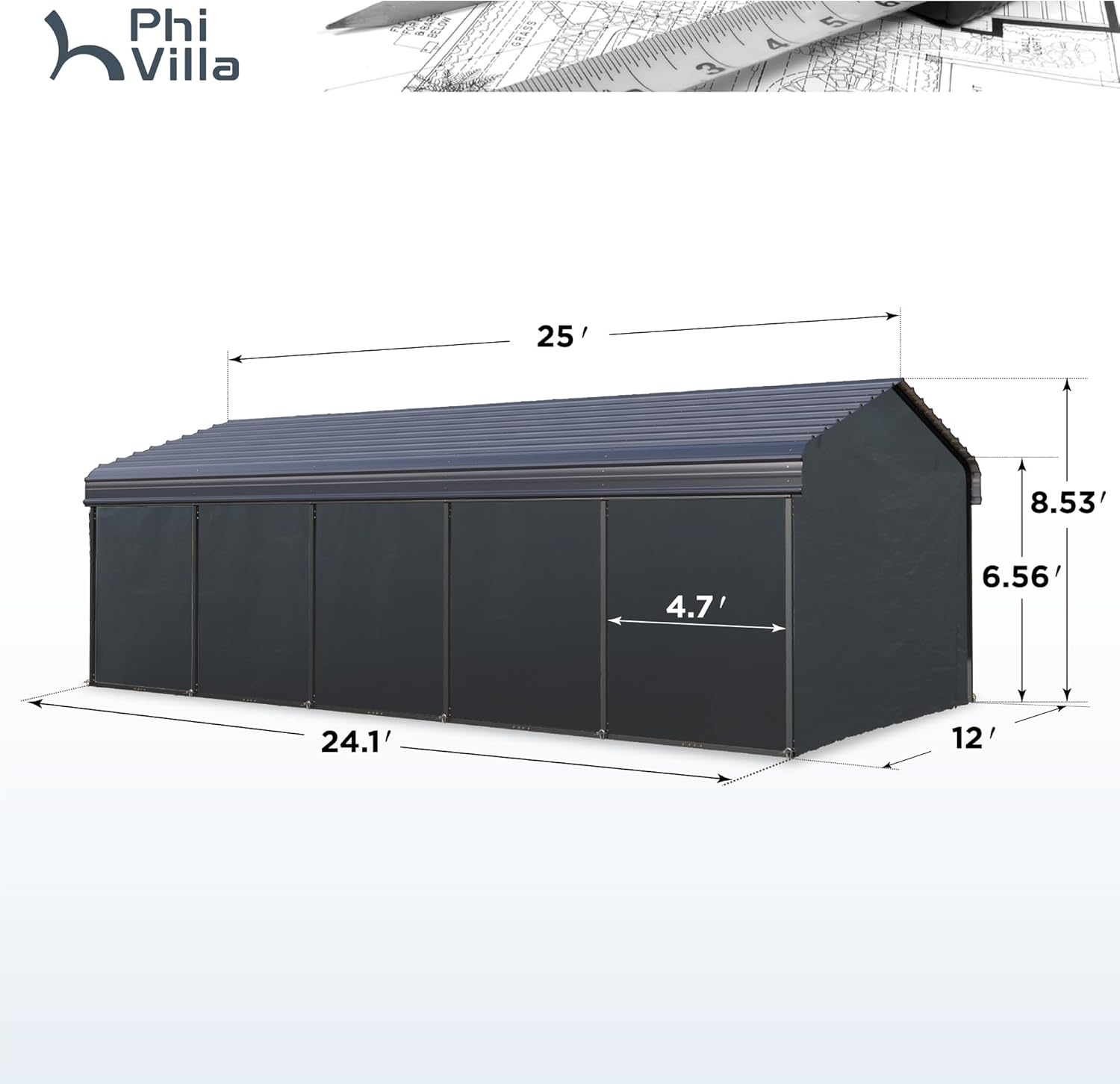 PHI VILLA 12 x 25 ft Heavy Duty Car Port with Galvanized Steel Roof with Sidewalls, Sturdy Metal Carport Kits for Cars, Boats, and Tractors