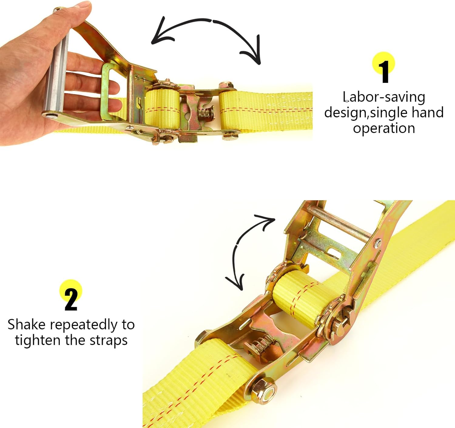 - 【Durable and Sturdy】Ratchet tie down straps heavy duty is made of metal steel and high density weaving of high quality polyester webbing fiber, features wear-resistance, corrosion-resistance, won't curl and superior breaking resistance. Super soft, does not hurt the goods. Release mechanism adpot steel heat treatment, has high hardness, not easy to rust and bend.
