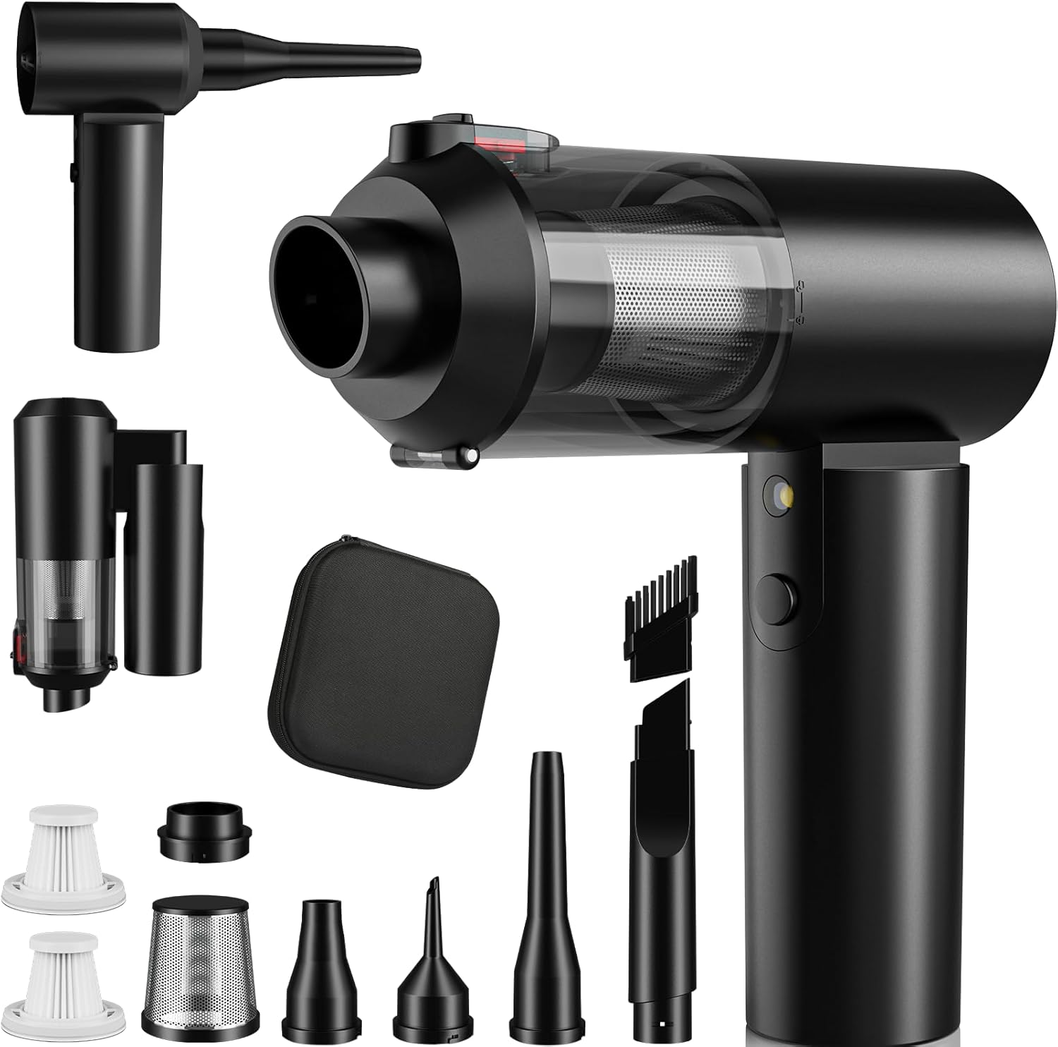 - 【90° Foldable & Portable】 The portable vacuum cordless is compact and easy to use. Its 90° foldable design allows the cordless car vacuum to be easily placed on the side of the car. The semi-hard and compact zipper case stores all parts, making this hand held vacuum cordless worry-free for travel—a perfect gift for family, friends, or car enthusiasts.
