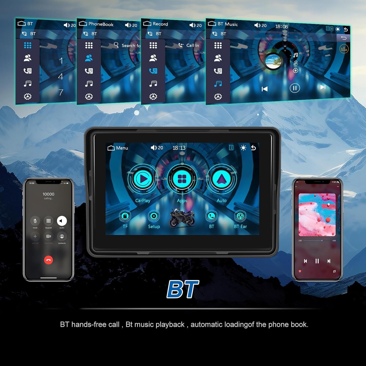 - [BUILT-IN BLUETOOTH HANDS-FREE] - Motorcycle apple carplay has Bluetooth connectivity, pair your phone to the carplay touch screen via Bluetooth, pair your Bluetooth helmet/earphone, convenient to adjust the volume, switch songs and make hands-free calls by your helmet or earphone. Enjoy the freedom of seamless connectivity and enhanced functionality while riding