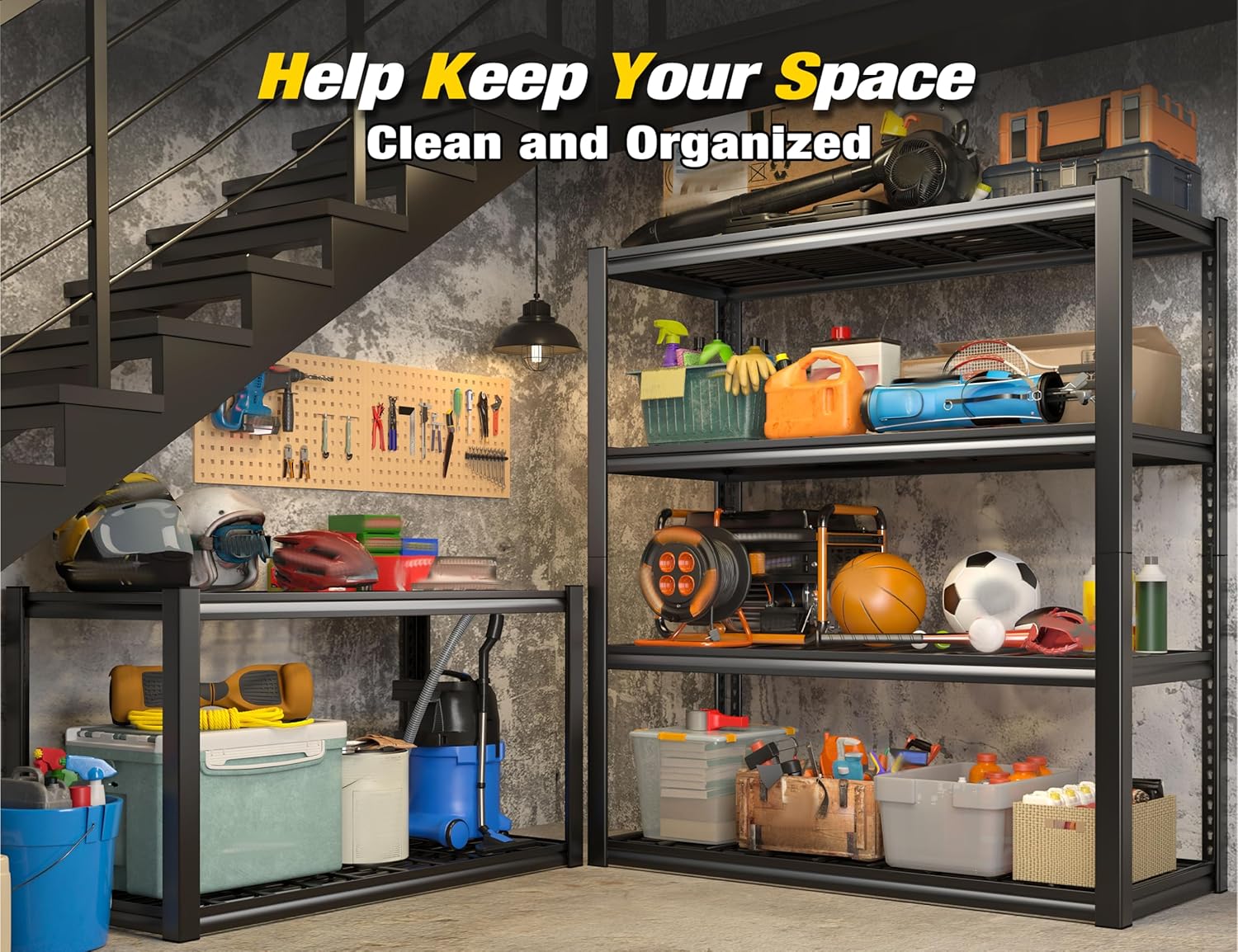 - ă2200 LBS Garage Shelving Heavy DutyăThis garage shelving is born for placing heavy objects, its load-bearing capacity can reach an amazing 2200LBS, each layer bearing 550LBS, even if you are stacked with fitness equipment on the top, this garage storage shelves will not be deformed and bent. The stable and strong garage shelves makes it completely suitable for warehouse, supermarket, industrial and other scenes, and can carry all kinds of heavy goods