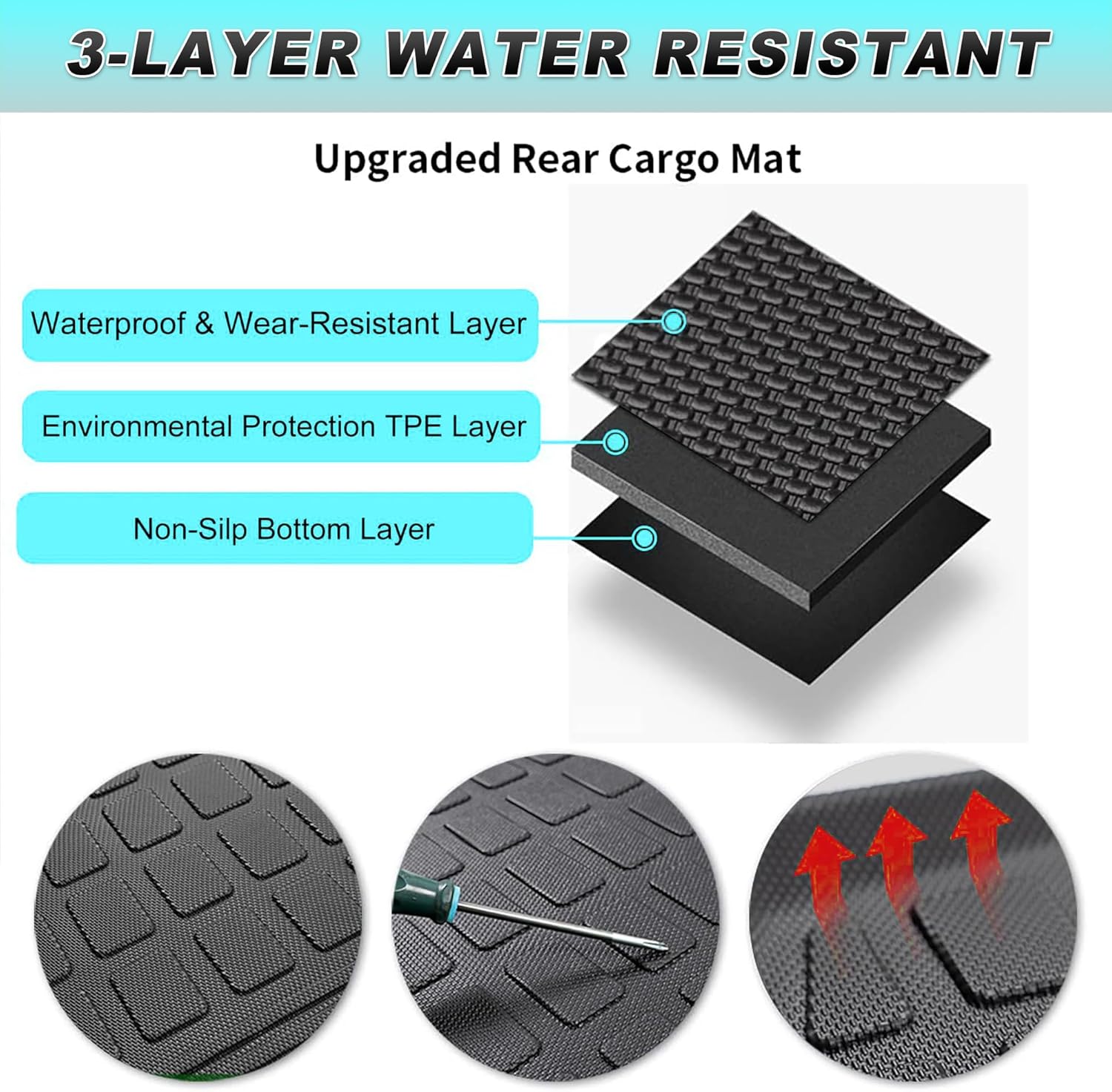 - ăAll Weather Protectionă Full set car cargo liners and back seat cover designed with high hemming to better protect car carpets, against dust, mud, salt, rain, snow, and sand, achieving all-weather protection, easy to clean and you no longer have to worry about bad weather damaging the car floors.