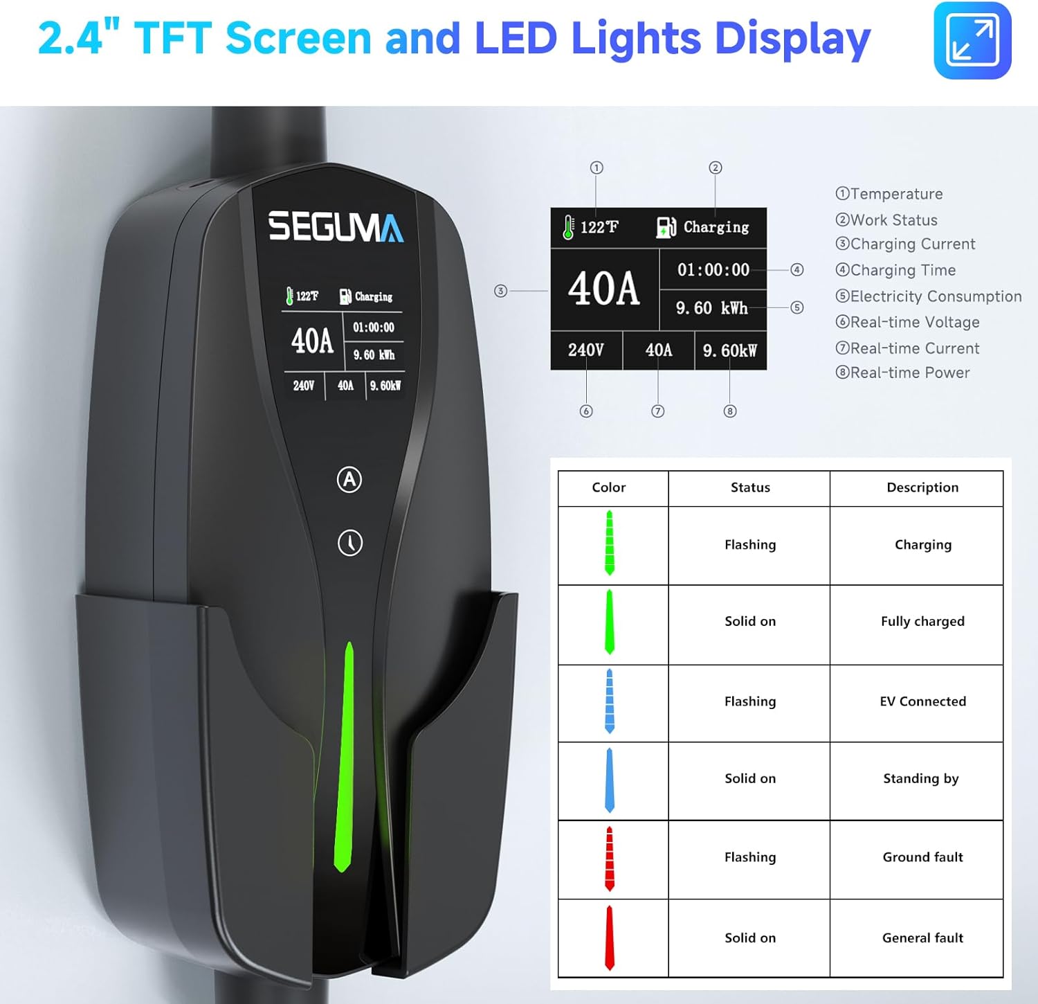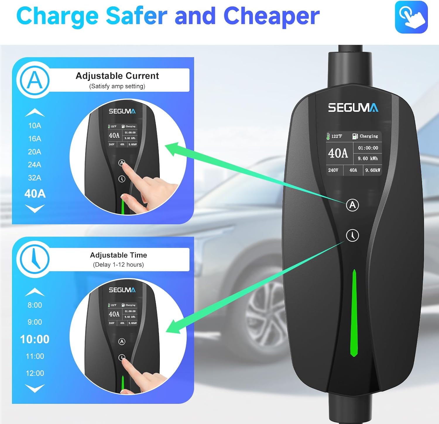 - Up To 9.6kWh High Speed Charging: The Seguma level 2 ev charger provides 40Amp current with 240V voltage, up to a max 9.6kW charging power. 6X faster charging compared to standard level 1 ev chargers, allowing you to charge your electric vehicle more quickly