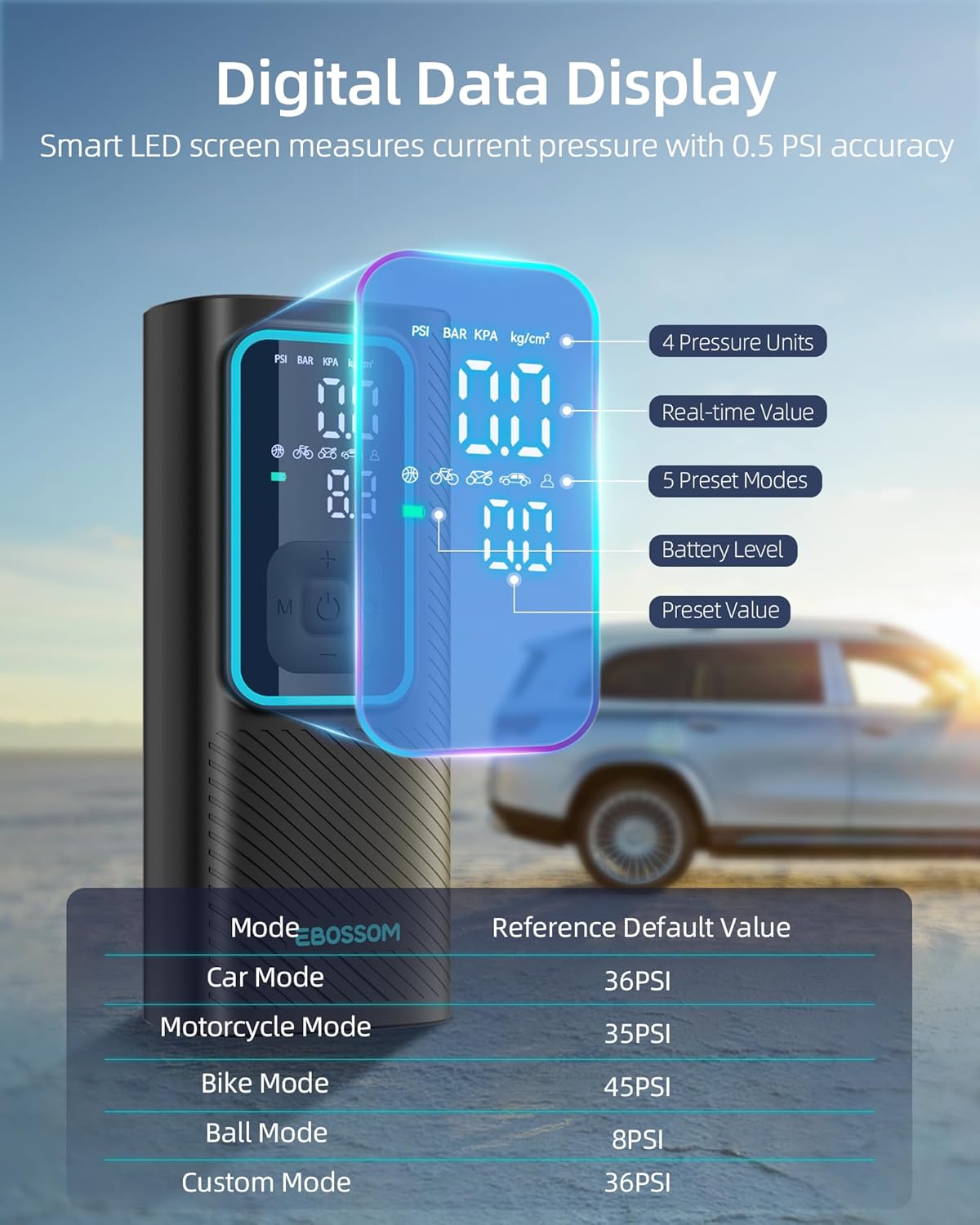 - USER-FRIENDLY DESIGN: This intelligent air pump boasts an LED display that accurately indicates the real pressure with precision of 0.5PSI. Set your desired pressure and it will automatically shut off when it's done. No more guessing or over-inflating.